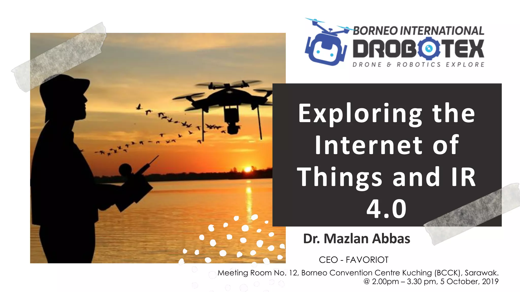 The document discusses the Internet of Things (IoT) and Industrial Revolution 4.0, highlighting key topics such as the phases of IoT maturity, barriers to IR 4.0, and the importance of pilot trials. It emphasizes the need for organizations to adapt to technological evolution for survival, and explores the enabling technologies of Industry 4.0, including robotics and artificial intelligence. Additionally, it outlines steps to build IoT solutions and presents scenarios where IoT can enhance various sectors.