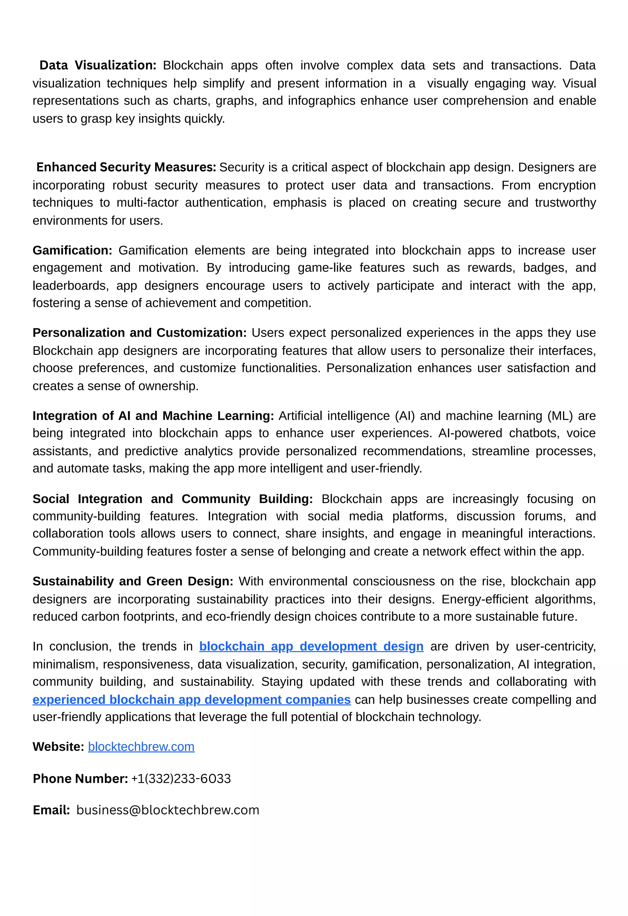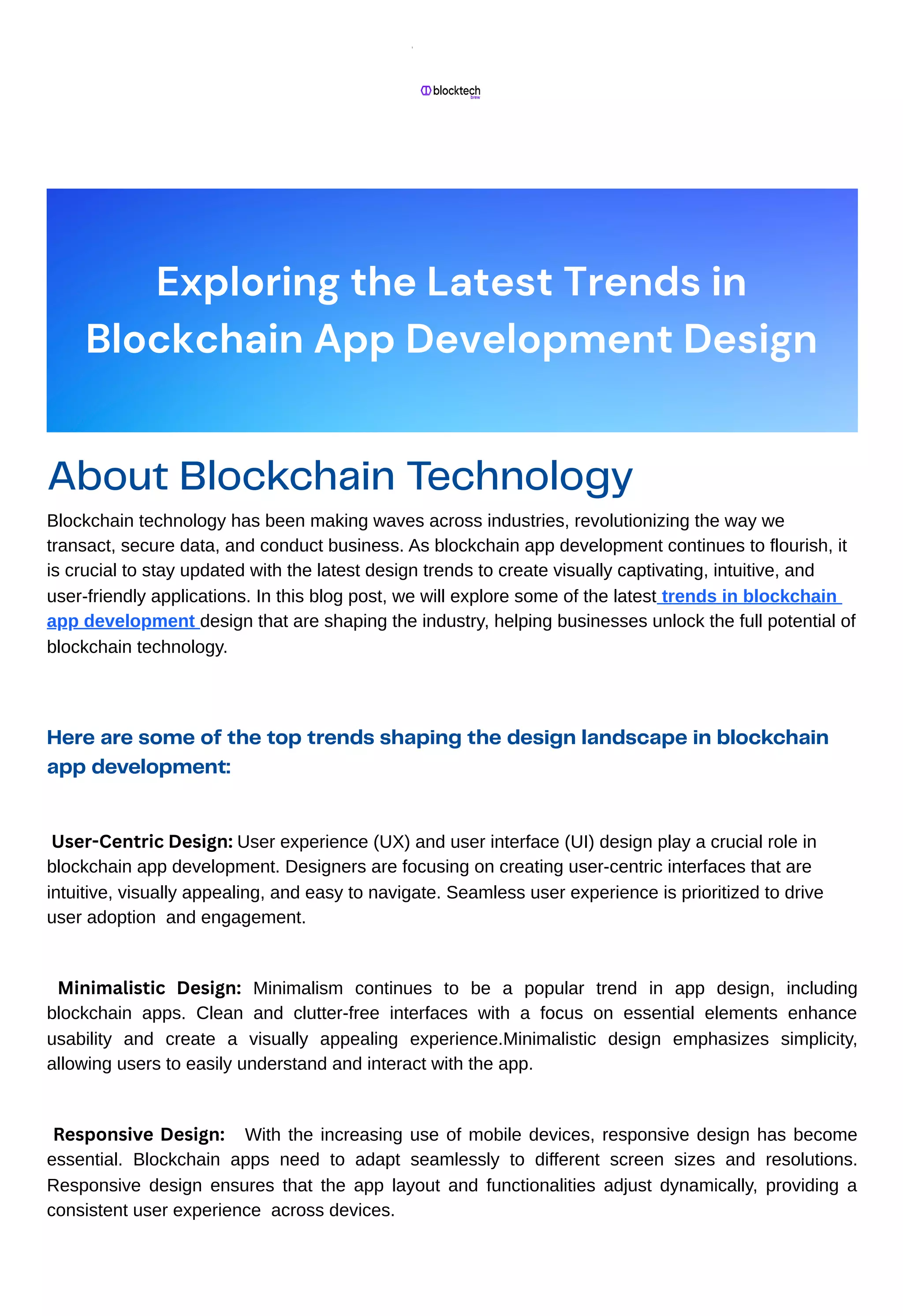 The document discusses current trends in blockchain app development design focused on enhancing user experience and engagement. Key trends include user-centric design, minimalistic aesthetics, responsive layouts, data visualization, enhanced security measures, gamification, personalization, and AI integration. It emphasizes the importance of keeping up with these trends to create effective and user-friendly blockchain applications.
