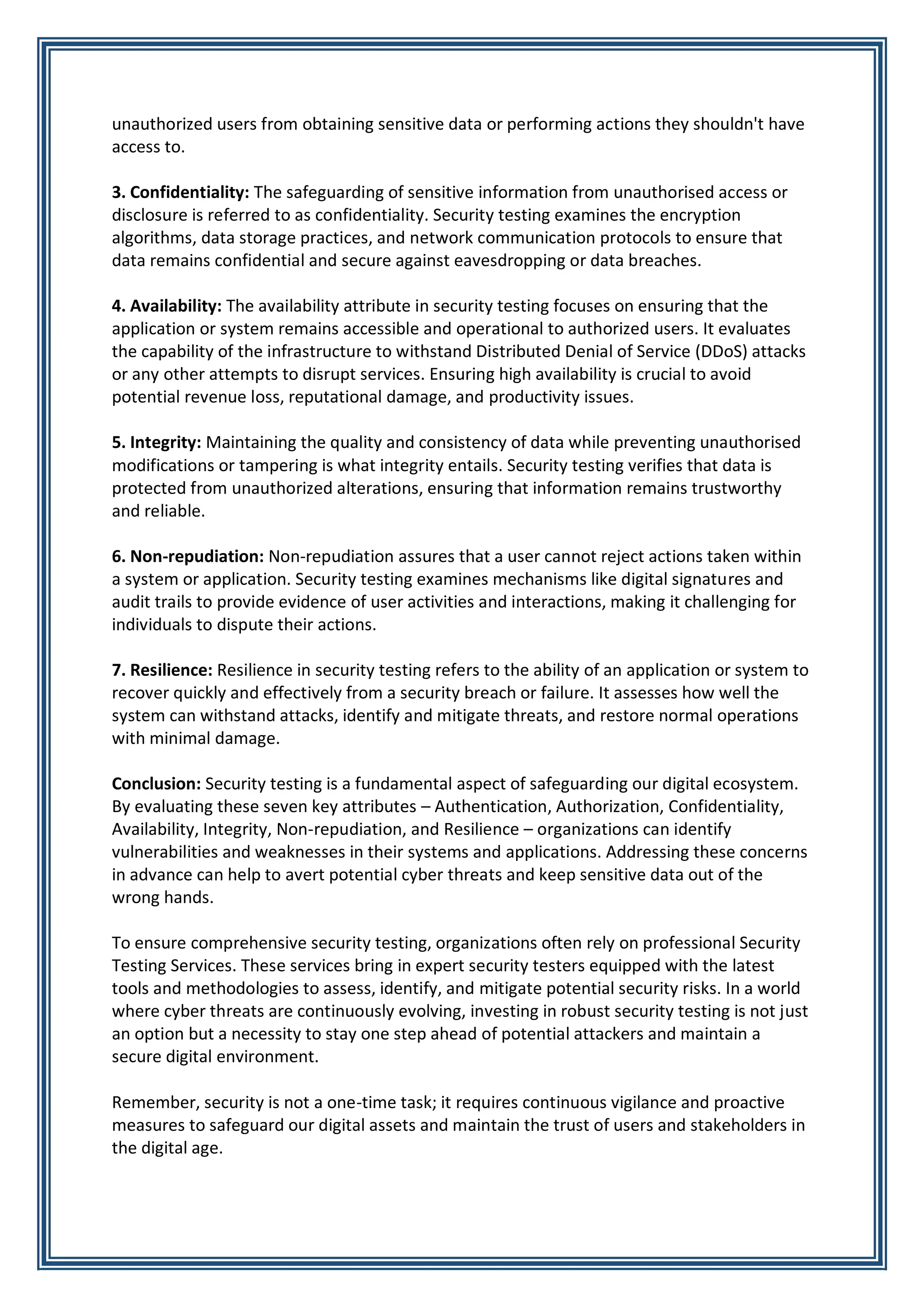 The document explores seven key attributes of security testing essential for safeguarding digital assets against cyber threats. These attributes—authentication, authorization, confidentiality, availability, integrity, non-repudiation, and resilience—help organizations identify vulnerabilities and ensure data security. It emphasizes the necessity of ongoing security testing and reliance on professional services to mitigate potential risks in an ever-evolving digital landscape.