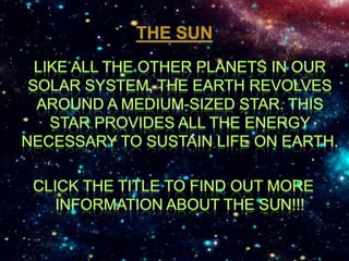 This document provides information about exploring the solar system. It includes sections on the sun, the moon, the planets, and why Pluto is no longer considered a planet. It encourages interactive activities like clicking links to learn more about each topic. The document uses headings, images, and links to divide up the information into digestible sections for students.