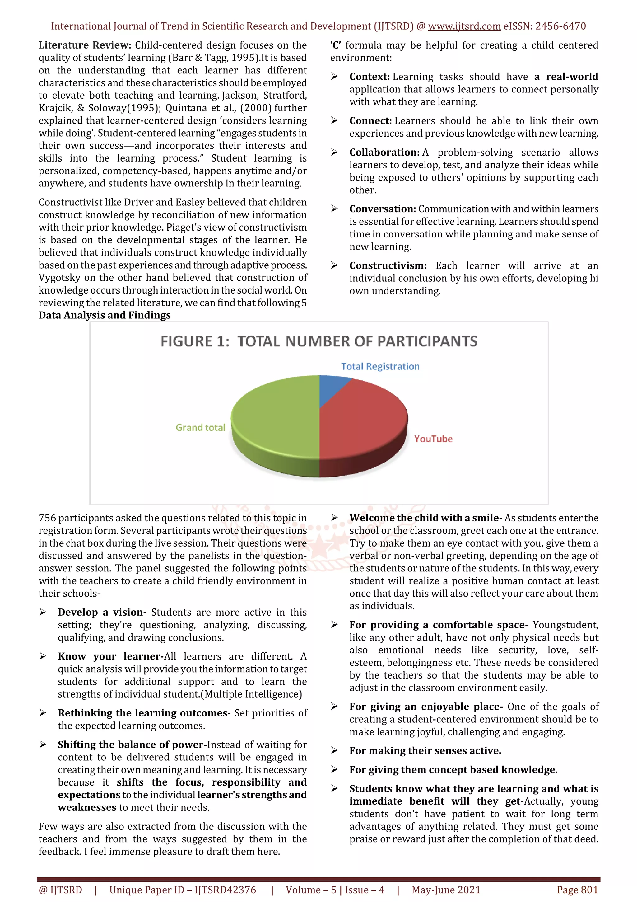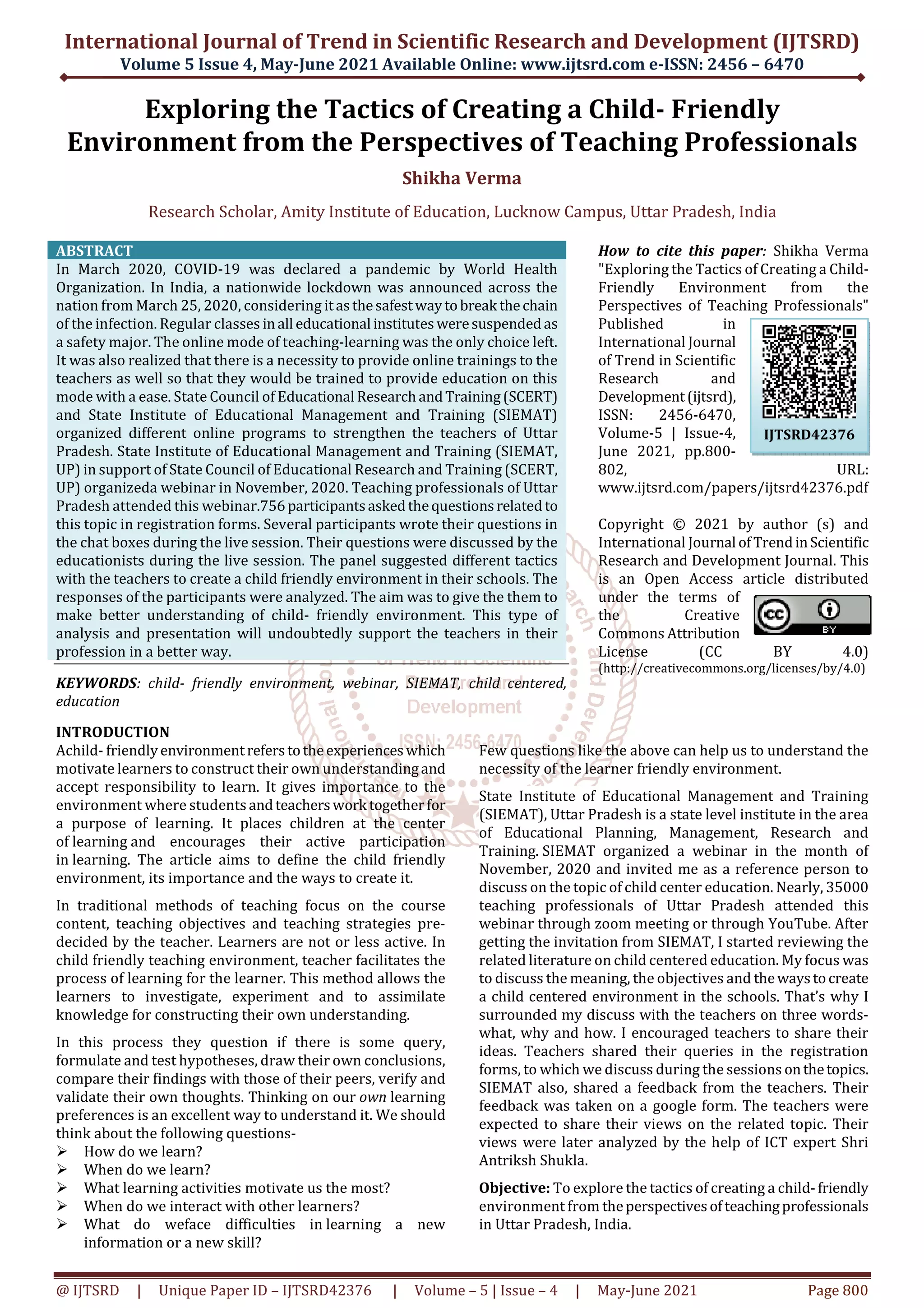 The document explores tactics for creating a child-friendly learning environment from the perspectives of teaching professionals in Uttar Pradesh, India. Following the pandemic-induced shift to online learning, a webinar was organized to discuss the importance of child-centered education, engage teachers, and analyze responses to improve teaching methods. Key strategies identified include focusing on individual learner needs, promoting active participation, and creating a supportive and engaging classroom atmosphere.