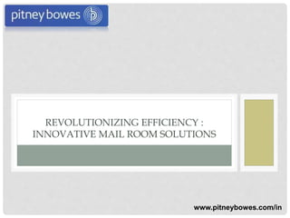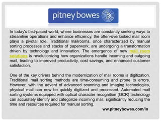 The document discusses the transformation of mail rooms through technology and innovation, highlighting the benefits of digitization, AI, and IoT solutions in enhancing efficiency and productivity. It emphasizes the shift towards sustainable practices and the role of modern mail room solutions in accommodating remote work and minimizing physical contact, especially during the COVID-19 pandemic. Overall, it outlines how these advancements lead to improved operations and customer satisfaction for businesses.