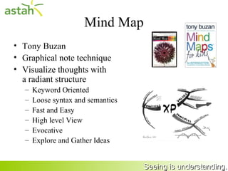 The document discusses using mind mapping to explore user wishes and develop use cases or user stories. It introduces mind mapping and its benefits, such as providing a visual and loose structure for exploring ideas. An example is provided of using mind mapping to interview a library client and develop a mind map of user wishes, use case diagram, user stories mind map, and user stories spreadsheet. The conclusion emphasizes that mind mapping is effective for gathering information, exploring topics freely, and providing a high-level view of user wishes to develop use cases and user stories.