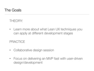 This document discusses Lean UX techniques that can be applied at different stages of product development. It begins with an overview of the goals of learning about Lean UX techniques and practicing collaborative design. Various techniques are then mapped to different development stages. Meeting participants are asked to suggest additional techniques and vote on ones they want to learn more about. Selected techniques are then briefly described, including contextual inquiry, stakeholder mapping, user experience mapping, personas, empathy mapping, elevator pitches, inception decks, user stories, story mapping, journey maps, and storyboards.