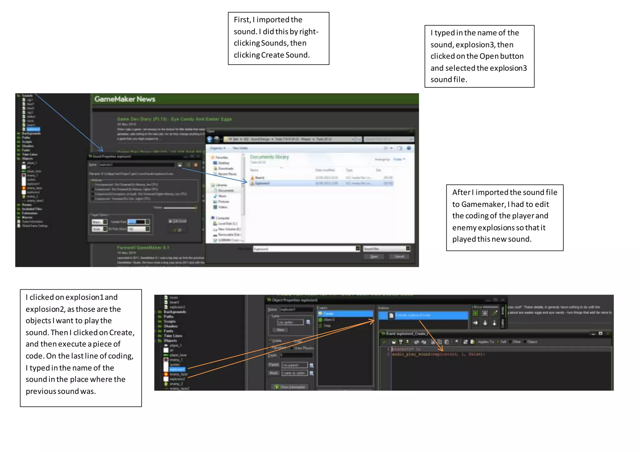 I imported a new sound file called "explosion3" into Gamemaker by right clicking Sounds, selecting Create Sound, naming the file, and selecting the sound file. I then edited the code for the player and enemy explosion objects to play the new sound by clicking on the objects, selecting Create, and replacing the previous sound name with "explosion3" on the last line of code.