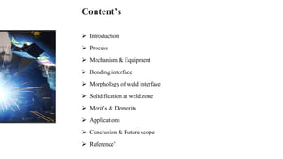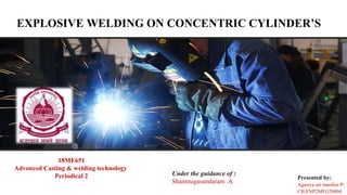 This document provides an overview of explosive welding on concentric cylinders. It discusses the explosive welding process, bonding interface, solidification at the weld zone, and applications. Explosive welding uses detonation of an explosive to accelerate one material into another, causing plastic deformation and bonding without melting. It can join many dissimilar metals and produces a weld joint stronger than the base metals. However, it is limited to simple geometries like flat or cylindrical surfaces. Applications include heat exchangers, pressure vessels, and repair of heat exchanger tubes.