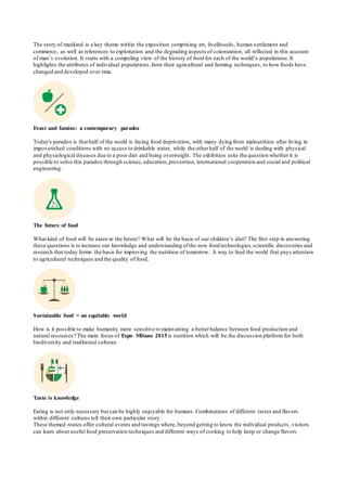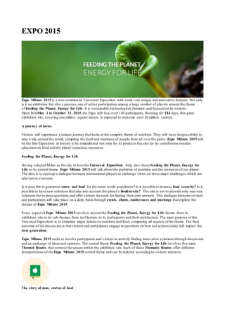 Expo Milano 2015 is a Universal Exposition held in Milan, Italy from May 1 to October 31, 2015 focused on the theme "Feeding the Planet, Energy for Life". Over 130 participants and expected 20 million visitors will explore solutions to global challenges of food security, sustainability, and biodiversity through exhibits, events, and discussions. National pavilions like Italy and China will showcase their traditions and innovations in agriculture and food to stimulate debate around nutrition and responsible resource management.