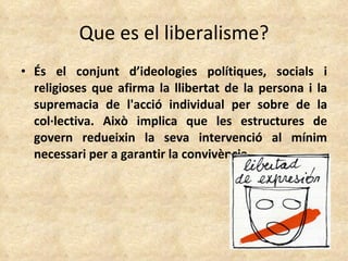 Que es elliberalisme? És el conjunt d’ideologies polítiques, socials i religioses que afirma la llibertat de la persona i la supremacia de l'acció individual per sobre de la col·lectiva. Això implica que les estructures de govern redueixin la seva intervenció al mínim necessari per a garantir la convivència.