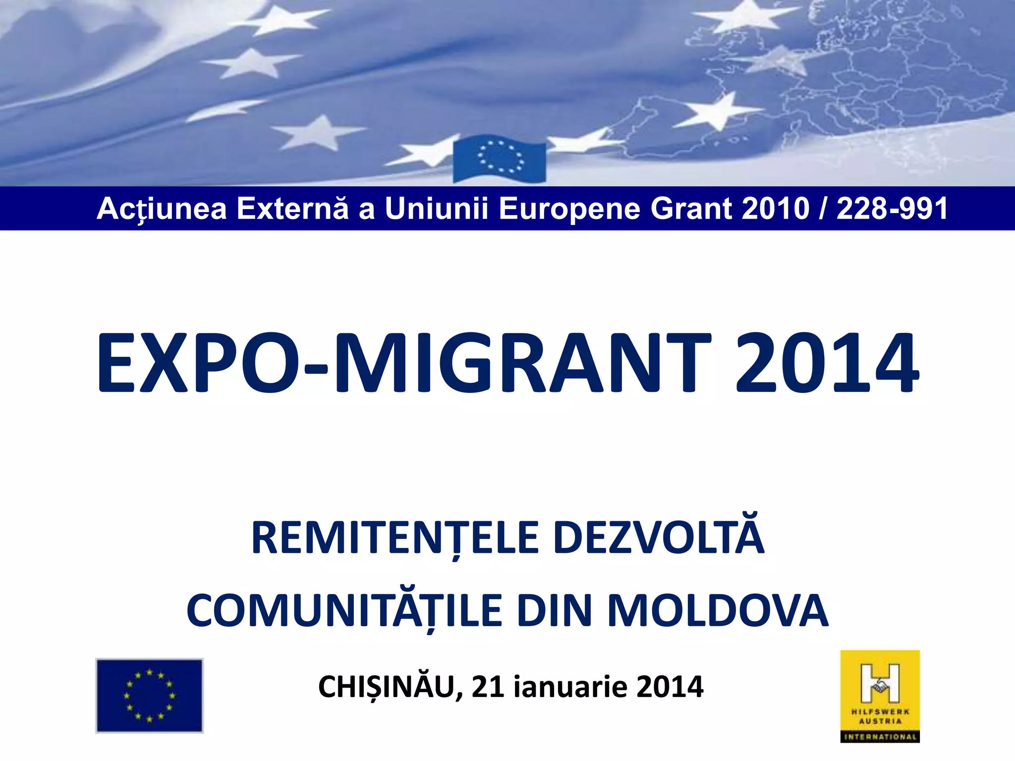 Documentul discută despre acțiunea externă a Uniunii Europene, axată pe granturi pentru susținerea comunităților din Moldova. Remitențele sunt identificate ca un factor important în dezvoltarea acestor comunități. Evenimentul a avut loc pe 21 ianuarie 2014, la Chișinău.