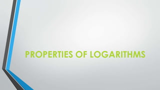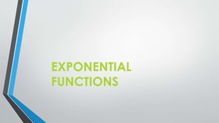 This document provides an overview of exponential and logarithmic functions. It defines one-to-one functions and inverse functions. It explains how to find the inverse of a one-to-one function and shows that the inverse of f(x) is f-1(x). Properties of exponential functions like f(x)=ax and logarithmic functions like f(x)=logax are described. The product, quotient, and power rules for logarithms are outlined along with examples. Finally, it discusses how to solve exponential and logarithmic equations using properties of these functions.