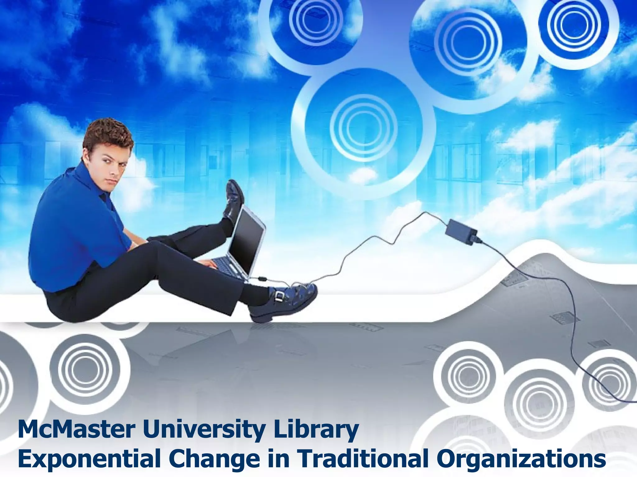 This document summarizes the challenges and changes that have occurred at McMaster University Library over the past several years under its new University Librarian. It describes how the library has transformed its services, resources, facilities, and staffing structure to better support the evolving needs of today's learners through innovative initiatives and partnerships. Key updates include the creation of 7 new librarian positions, investments in staff training, the adoption of new technologies like Second Life reference and an open source ILS, and the development of new learning spaces on campus.
