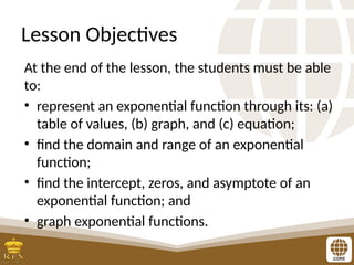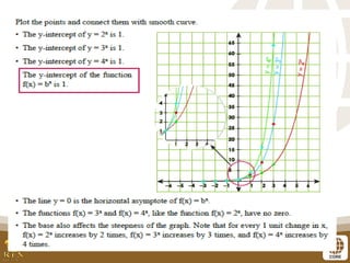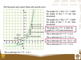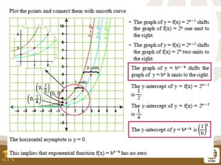 The document covers the teaching of exponential functions, including their representation through tables, graphs, and equations, as well as the characteristics such as domain, range, and asymptotes. It also discusses transformations of shapes, including reflections and translations, and how to graph various exponential functions. Examples and exercises are provided to reinforce understanding of the concepts presented.