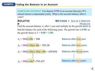 The document discusses exponential growth and decay models. Exponential growth models use the formula y = C(1 + r)t, where C is the initial amount, t is time, r is the growth rate, and (1 + r) is the growth factor. Exponential decay models use the formula y = C(1 - r)t, where (1 - r) is the decay factor and r is the decay rate. Examples are provided to demonstrate how to write, graph, and apply these models to problems involving compound interest, population growth, radioactive decay, and purchasing power.