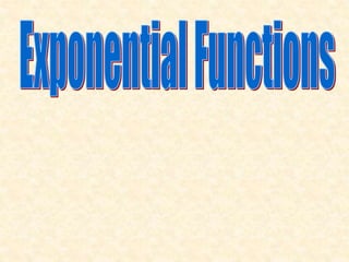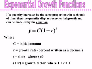 The document discusses exponential growth and decay models. Exponential growth models take the form y = C(1+r)t, where C is the initial amount, r is the growth rate, and t is time. Exponential decay models take the form y = C(1-r)t, where C is the initial amount, r is the decay rate, and t is time. Examples are provided to demonstrate how to write the models, identify the key variables, and solve problems using exponential growth and decay equations.