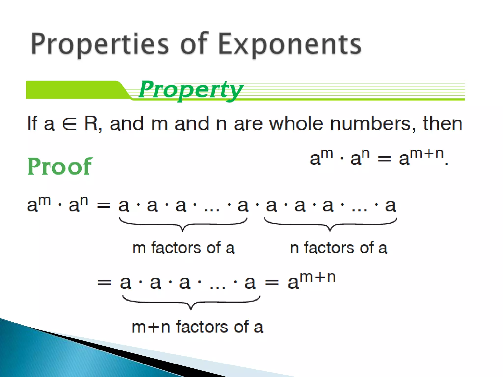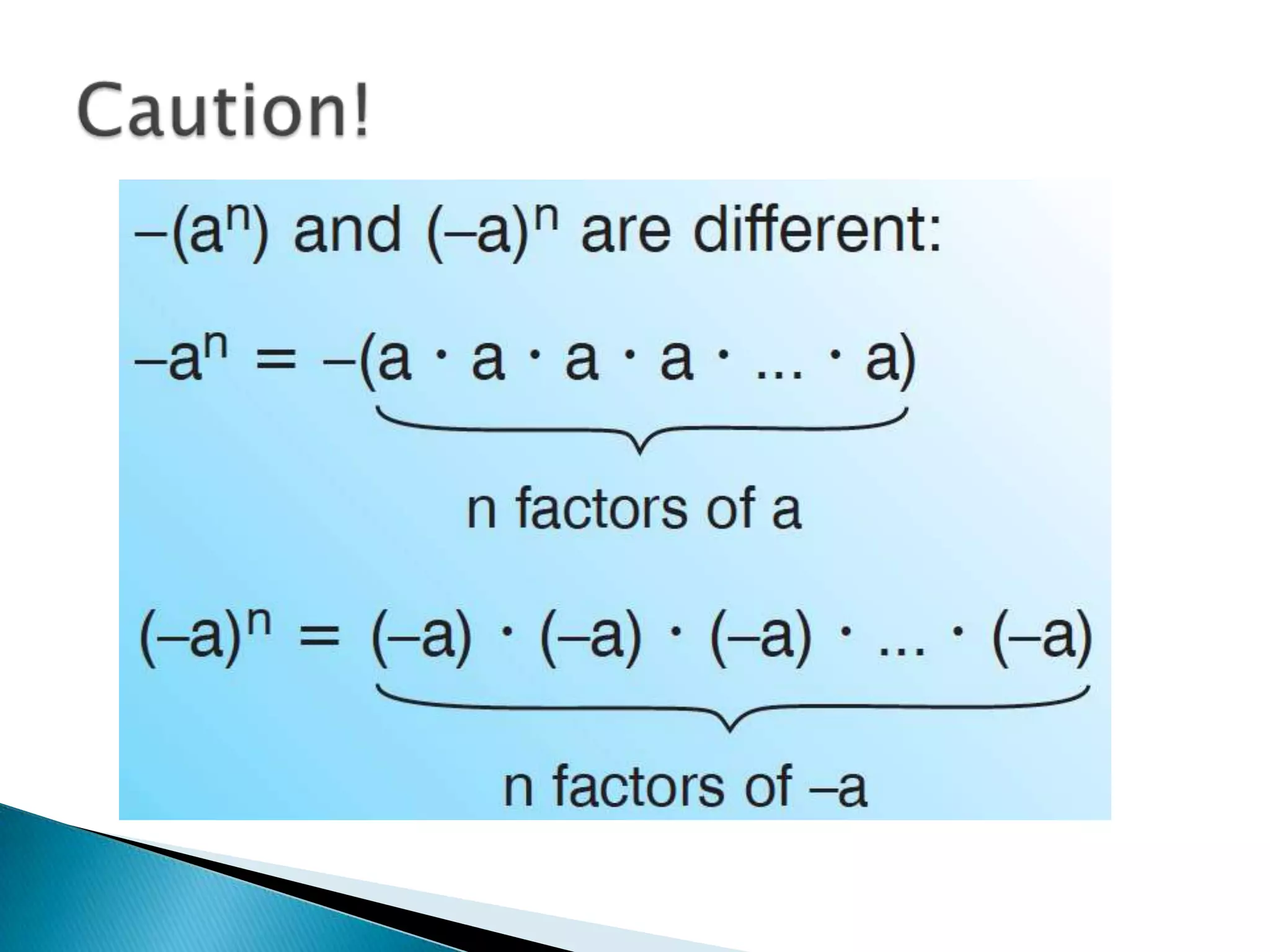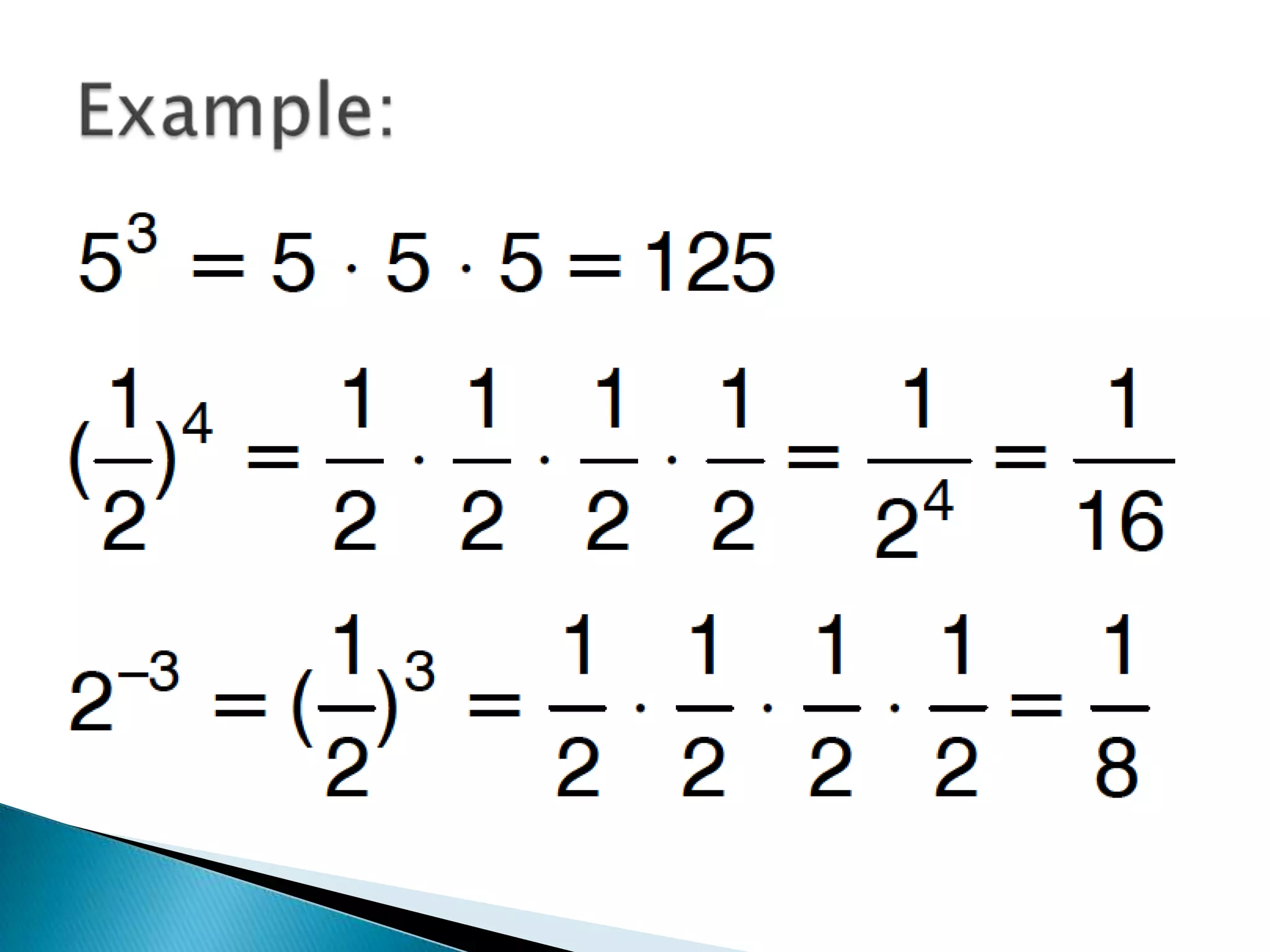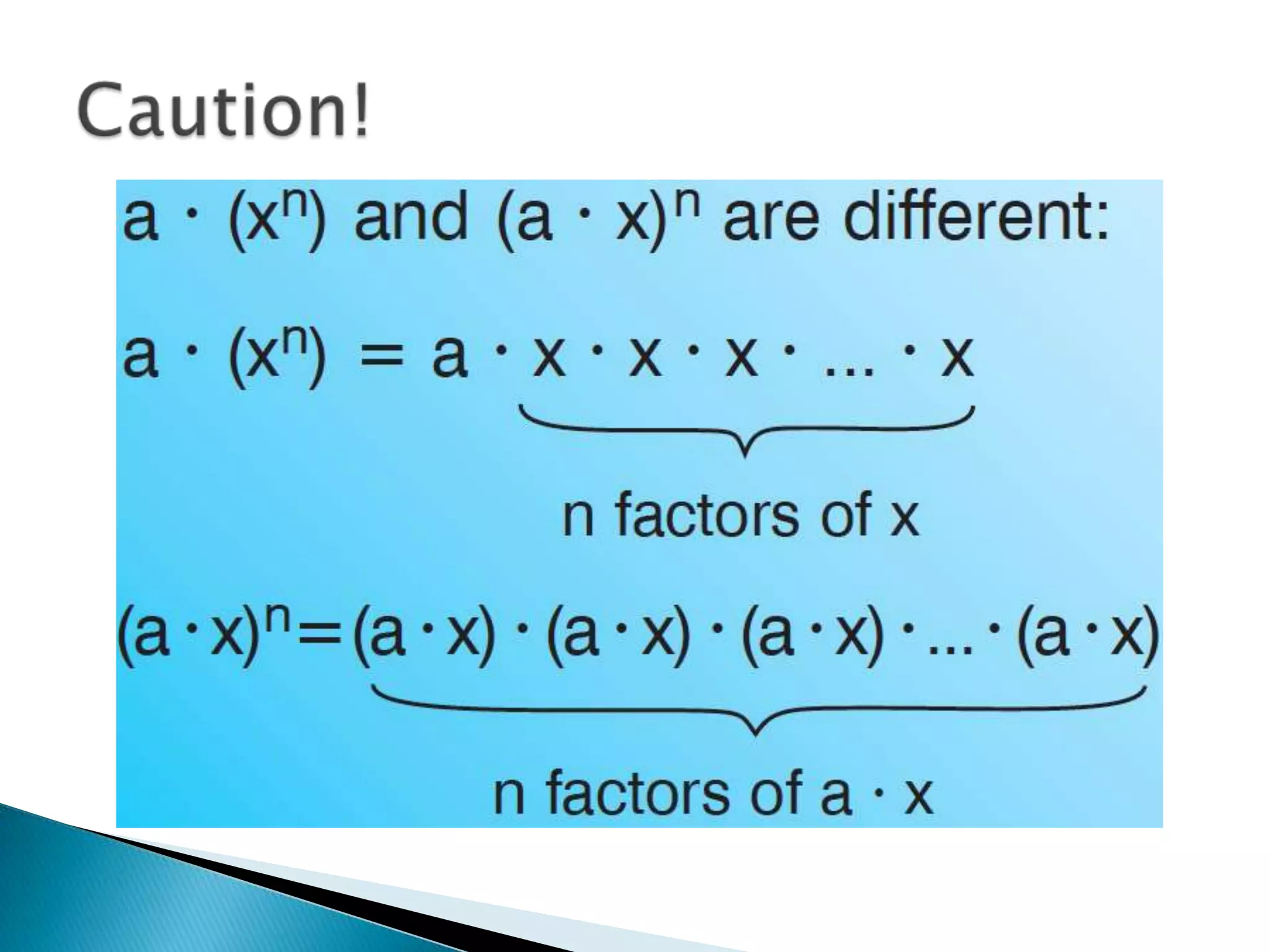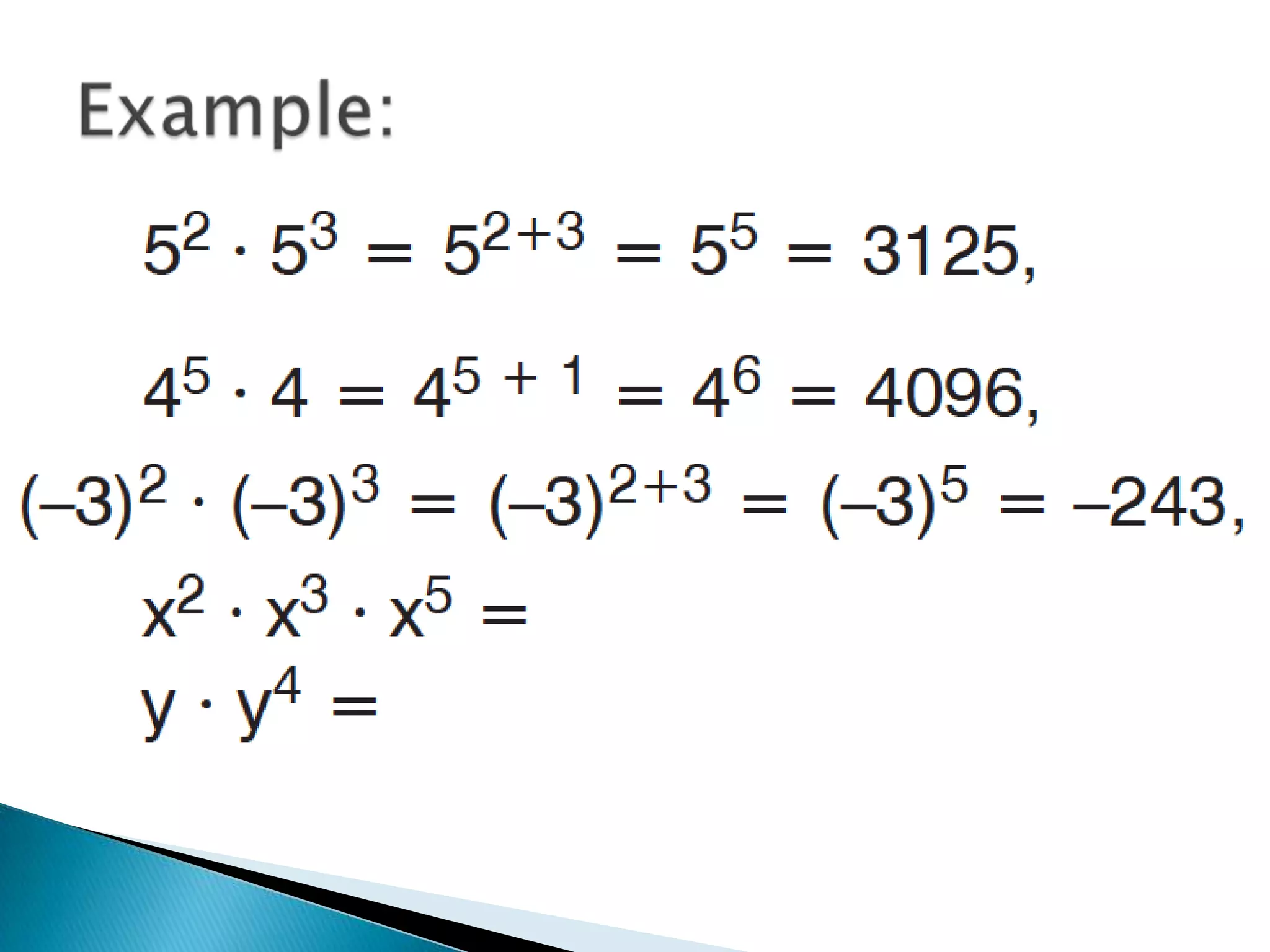 The document discusses exponents and exponential expressions. It defines exponential expressions as involving a base number being multiplied by itself a certain number of times, called the exponent. It provides examples of exponential expressions and how they are read out loud. It also outlines some properties of exponential expressions, such as all powers of positive numbers being positive and the behavior of even and odd powers of negative numbers. Finally, it discusses like terms in exponential expressions and an identity property involving exponents.