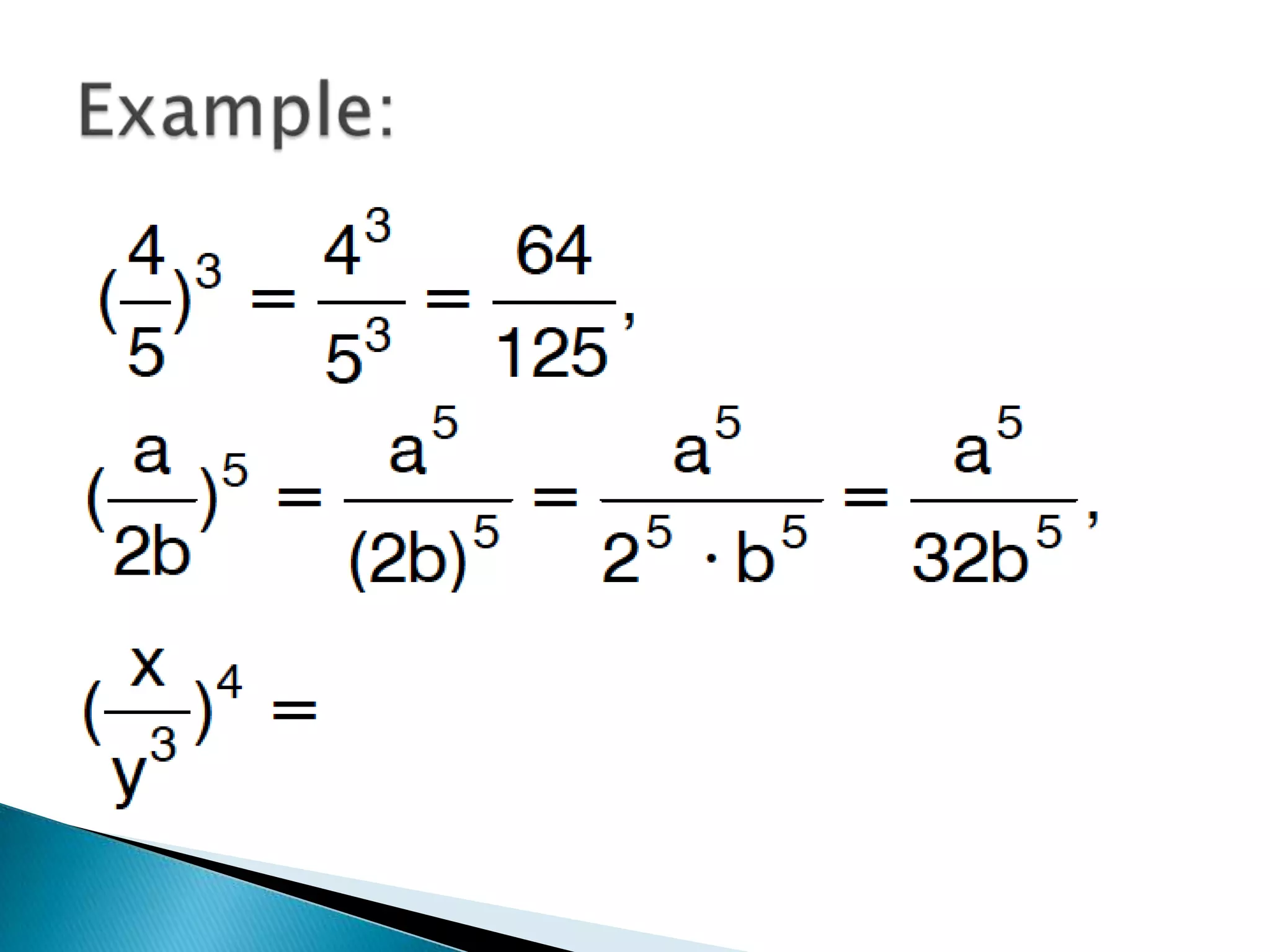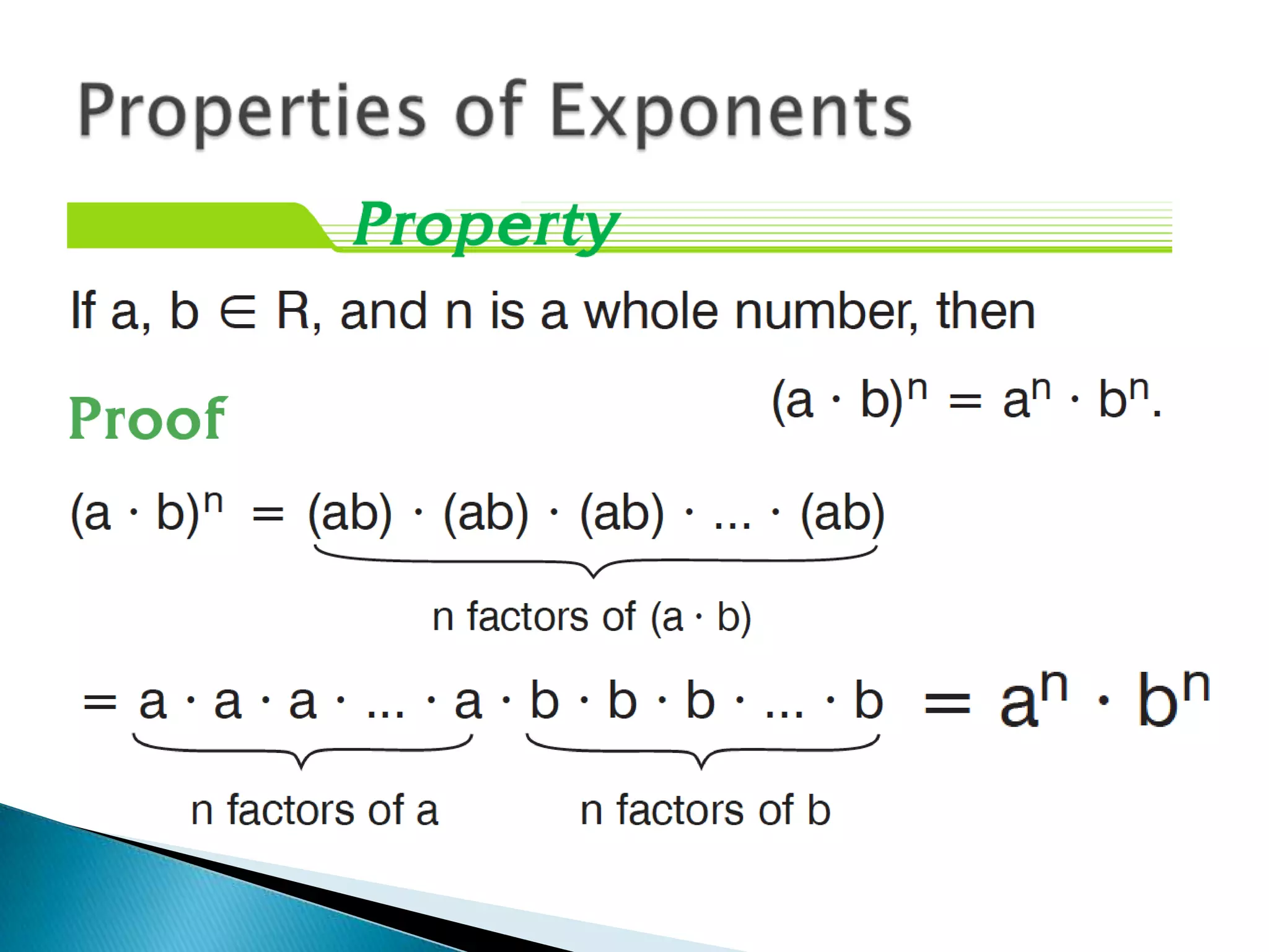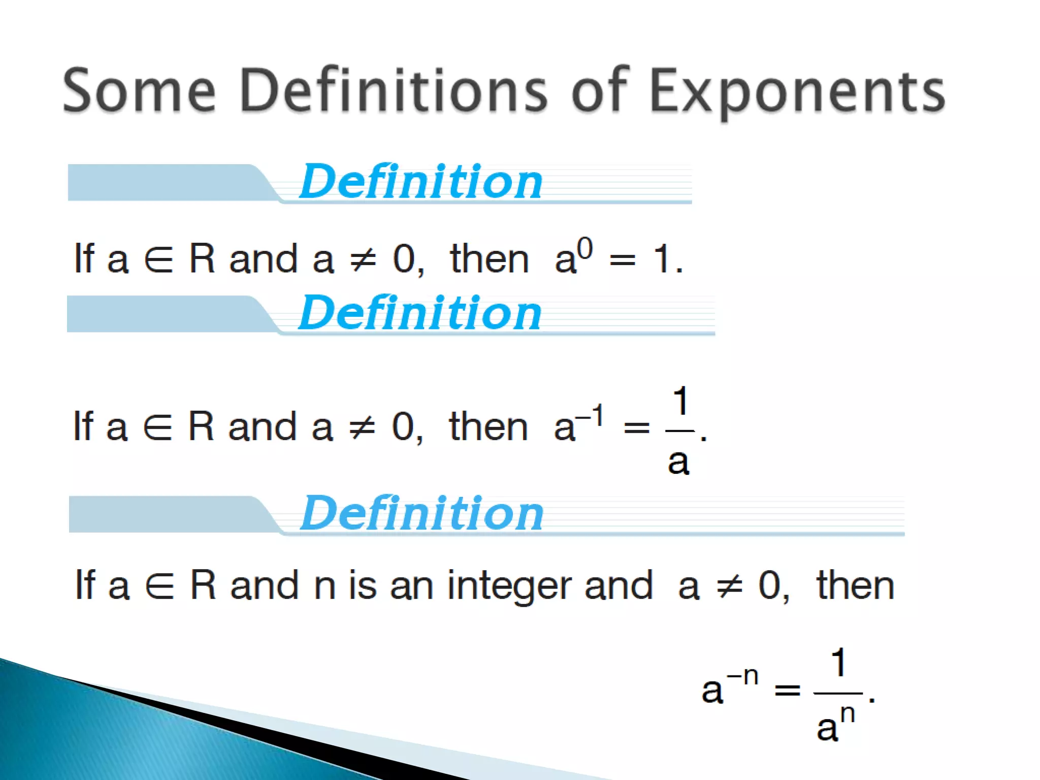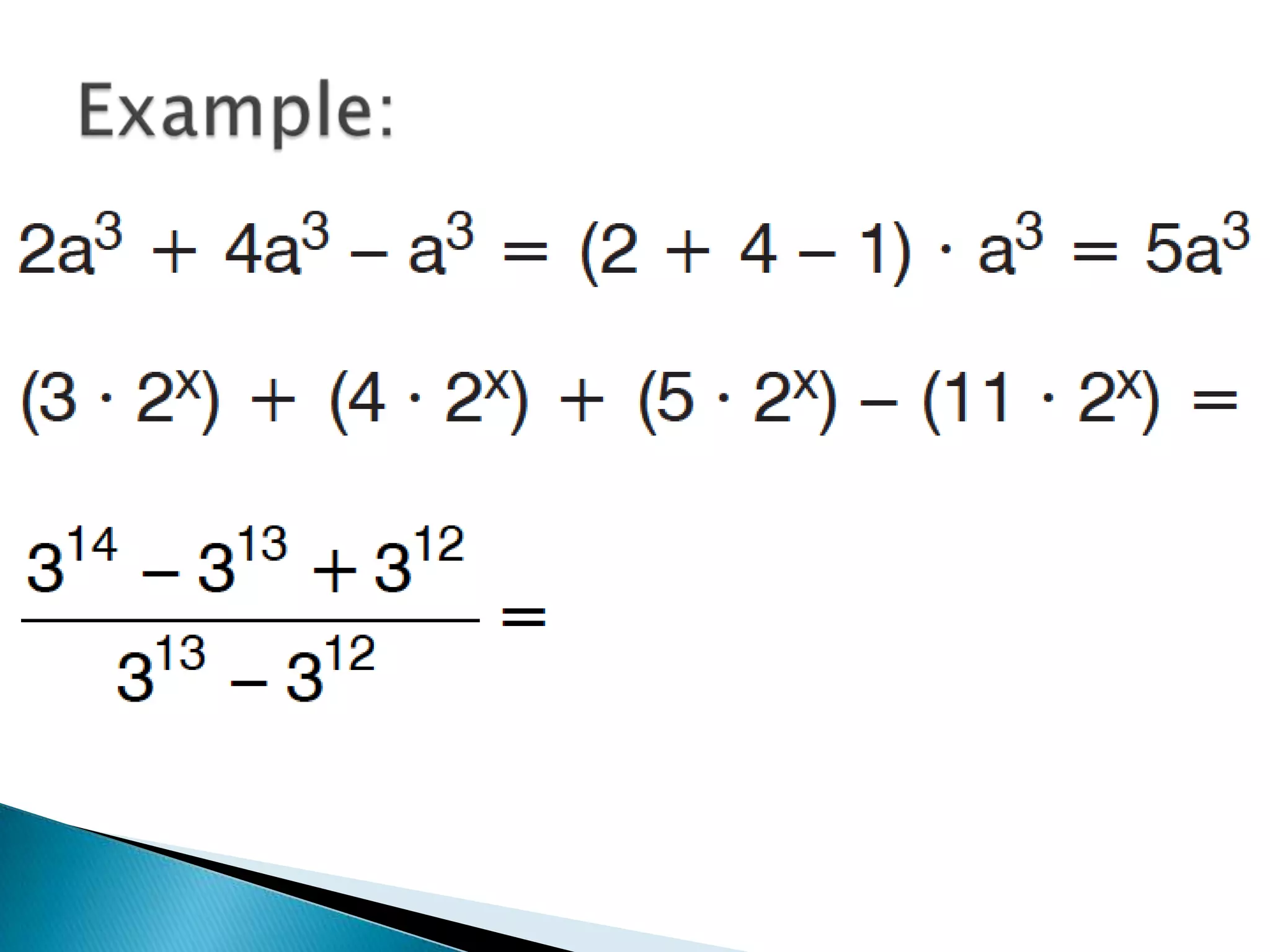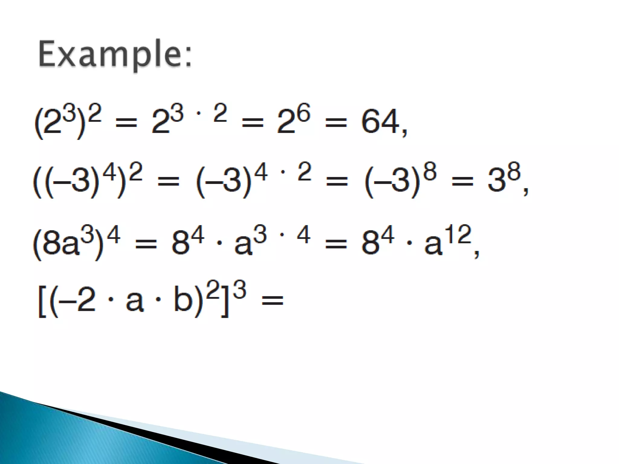 The document discusses exponents and exponential expressions. It defines exponential expressions as involving a base number being multiplied by itself a certain number of times, called the exponent. It provides examples of exponential expressions and how they are read out loud. It also outlines some properties of exponential expressions, such as all powers of positive numbers being positive and the behavior of even and odd powers of negative numbers. Finally, it discusses like terms in exponential expressions and an identity property involving exponents.