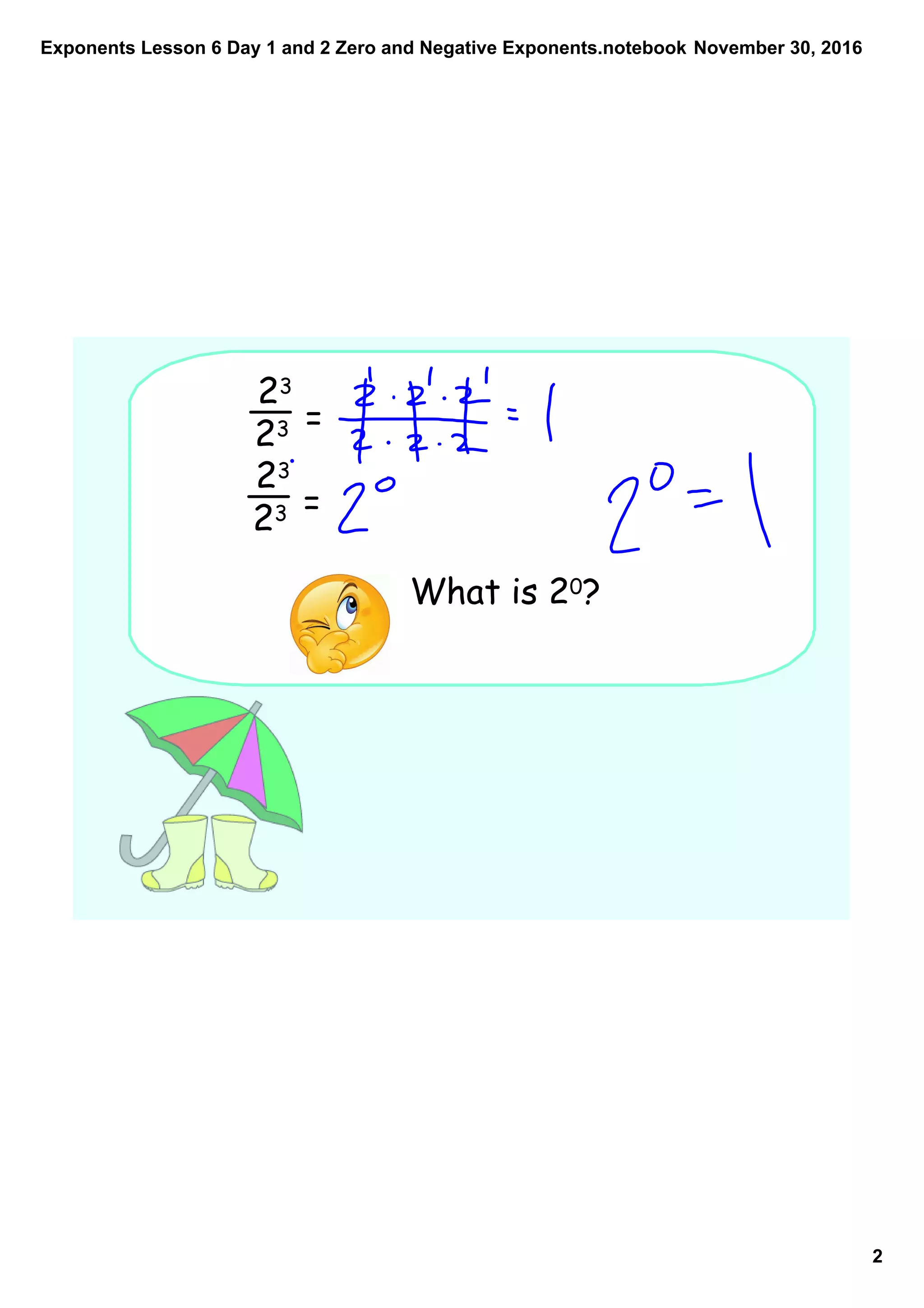 This document is from an exponents lesson on zero and negative exponents. It introduces the rule that anything to the zero power is equal to 1. It then covers the negative exponent rule, which states that if there is a negative exponent in the numerator, the base and exponent move to the denominator, and vice versa. Examples are provided to demonstrate simplifying expressions using these rules for zero and negative exponents.