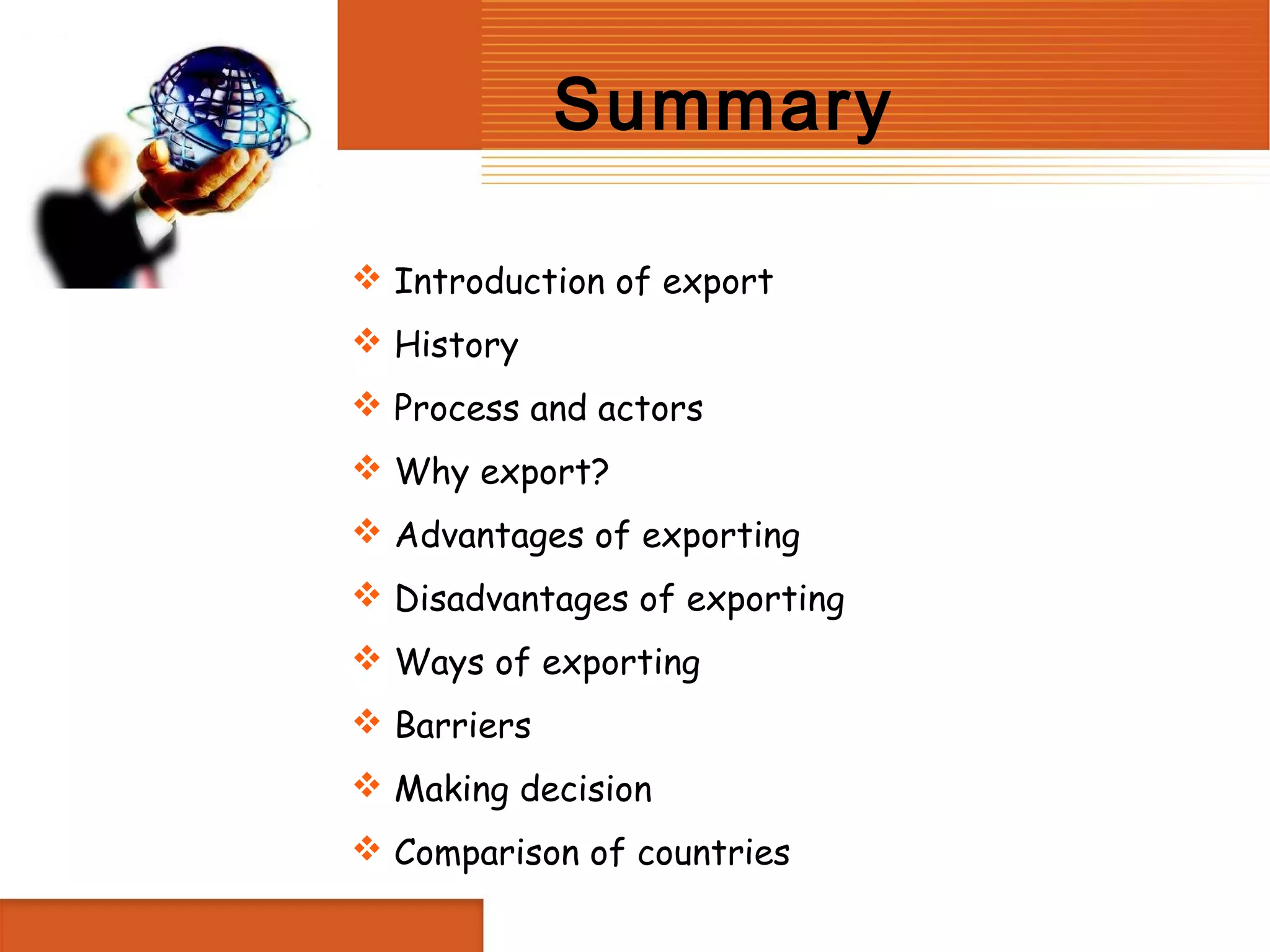 The document provides an overview of export, including its definition as goods produced in one country being shipped to other markets. It discusses the history and process of export, identifying key actors like exporters, banks, and customs agencies. The document outlines reasons for exporting like increasing sales and diversifying sources of revenue. It also examines advantages and disadvantages as well as direct and indirect methods of export. Barriers to export and factors to consider in the export decision-making process are presented. Country-level export data is given to facilitate comparisons.
