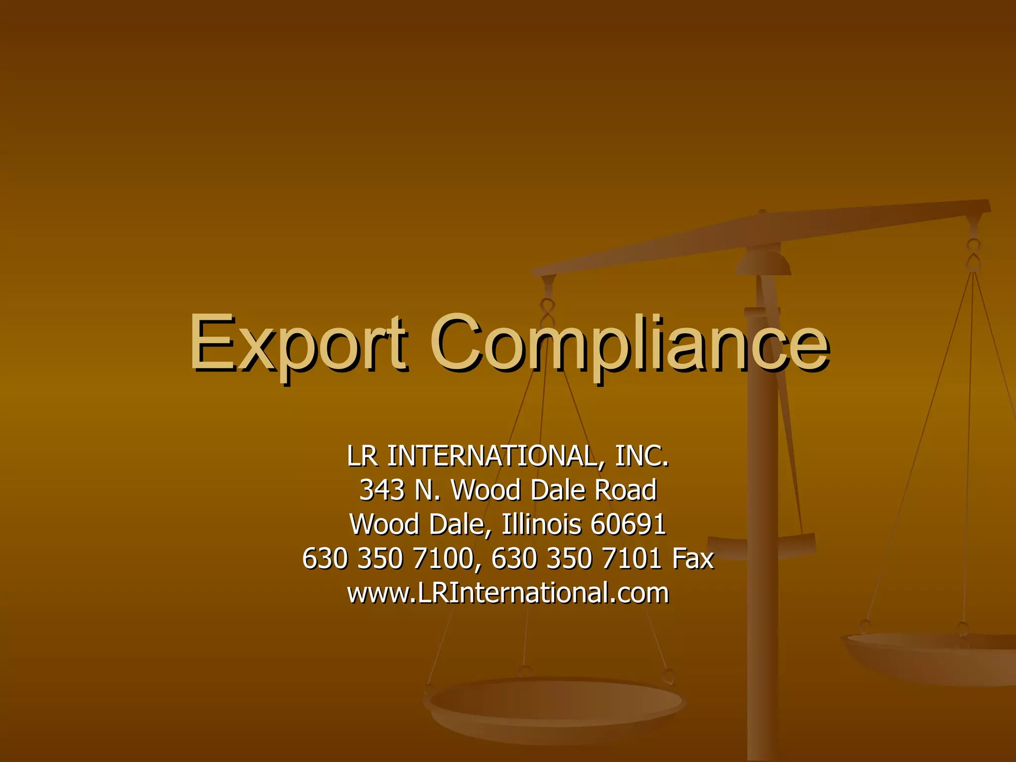 The document provides information about export compliance for LR International, including establishing an export compliance system, understanding export regulations, controlling commodities, approving customers, using licensed service providers, and understanding legal requirements like the Shipper's Export Declaration and Automated Export System for documenting exports. It emphasizes the importance of knowing regulations, customers, destinations, and keeping good records.