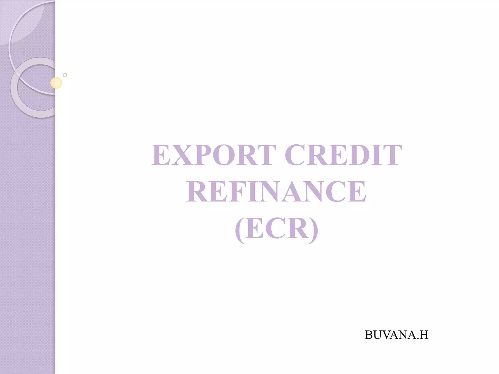 This document discusses export credit refinance facilities provided by the Reserve Bank of India (RBI) to banks. It defines key terms and outlines two main facilities - the rupee refinance facility and a special dollar refinance facility introduced to support pre-shipment export credit in foreign currency. Under the rupee facility, banks can access refinancing of up to 50% of their outstanding rupee export credit at the RBI's repo rate. The special dollar facility allows banks to swap rupees for dollars from RBI at market rates, using the dollars to provide export financing while paying the rupee refinance rate. Documentation, interest rates, and other terms are also outlined.