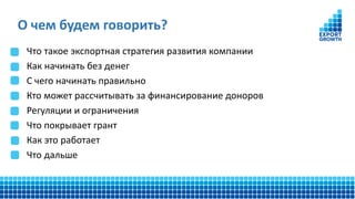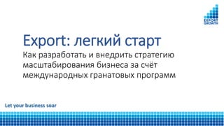 Документ описывает стратегию масштабирования бизнеса через экспортные гранты и программы, предоставляемые различными организациями. Он предоставляет информацию о том, как начать экспорт без финансовых вложений, критерии для получения грантов и примеры успешных проектов. Особое внимание уделяется разработке цифровых стратегий и маркетинговым действиям для выхода на новые рынки, в частности, в Польшу.
