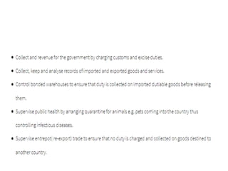 This document provides information on the key parties involved in exports and imports and their functions. It discusses the meaning and importance of exports and imports. The major parties in exports and imports include importers, exporters, RBI, authorized dealers, buyer's bank, DGFT, customs authorities, EPCs, government ministries, testing laboratories, insurance companies, inspection agencies, clearing and forwarding agents, and shipping companies. It then describes the functions of these various parties like facilitating trade, providing financing, inspections, certifications, and transportation. Promotional organizations like EXIM Bank, ECGC, and export councils assist exporters, while customs and DGFT regulate and monitor imports and exports.