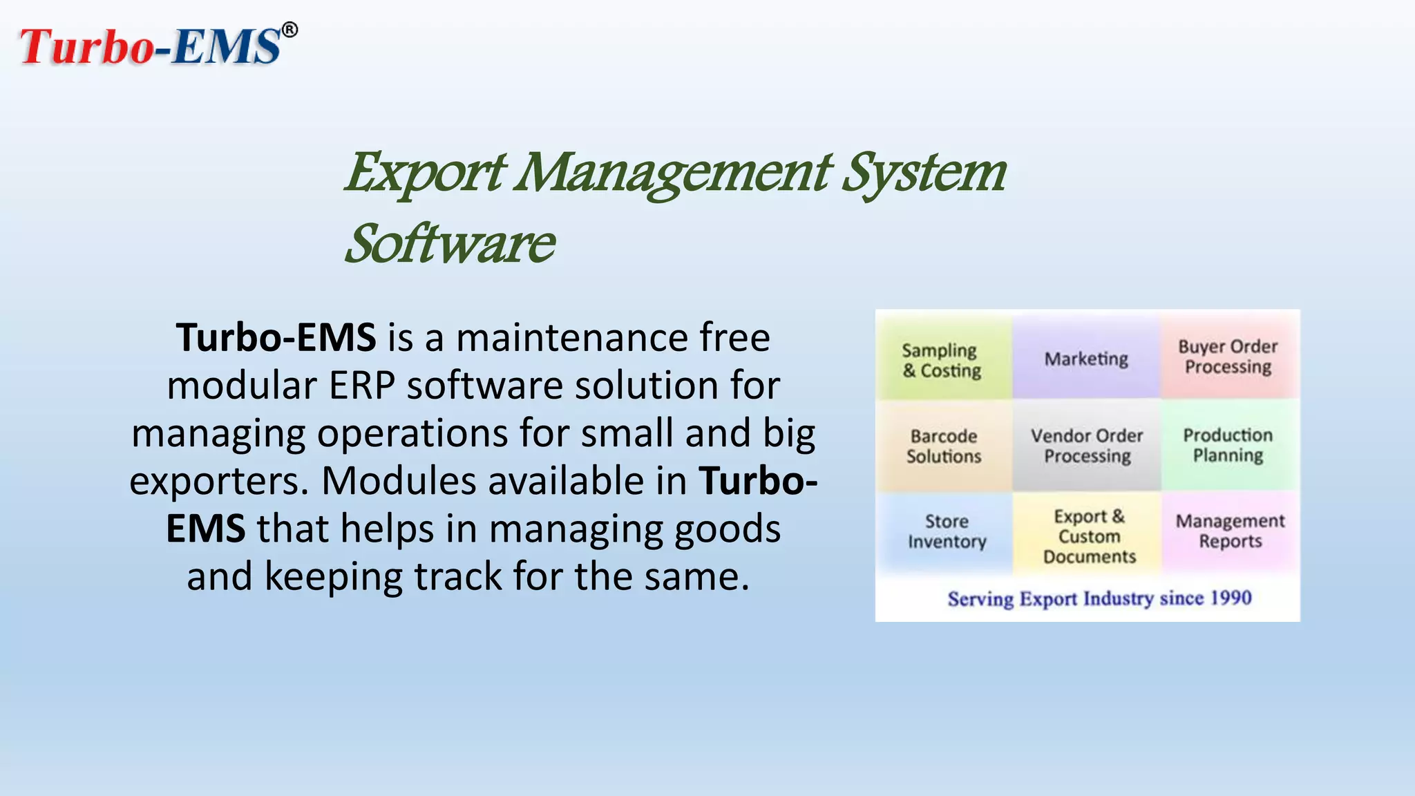 Turbo-EMS is a modular ERP software solution designed for managing operations of exporters, suitable for both small and large enterprises involved in various sectors such as handicrafts and auto parts. It offers features like product costing, order tracking, inventory management, and integrates with Tally, aiming to reduce manpower and save time and costs. The software is developed by Shiva Infotech Innovations Pvt Ltd, and it provides extensive tools to facilitate efficient export management.