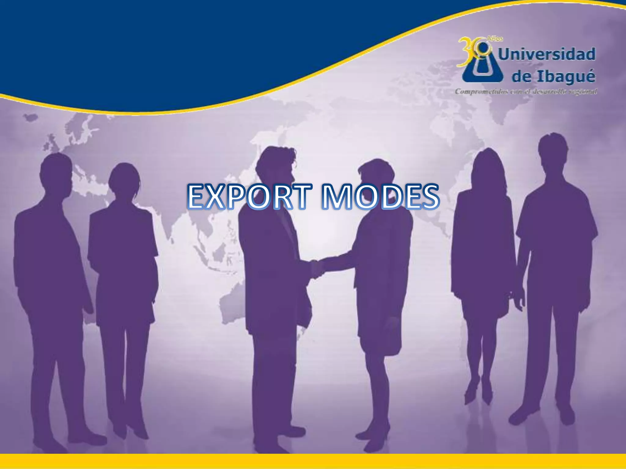 This document defines 10 modes of export in Colombia including: 1) Definite export which regulates the exit of goods for definitive use or consumption abroad, 2) Temporary export for passive completion which regulates the temporary exit of goods for transformation abroad, 3) Temporary export for reimporting in the same conditions which regulates the temporary exit of goods to be reimported without modification, and 4) Special export programs which allows foreigners to purchase raw materials from Colombian producers and have goods manufactured for export. Each mode has essential elements such as required documents, value limits, and authorization requirements.