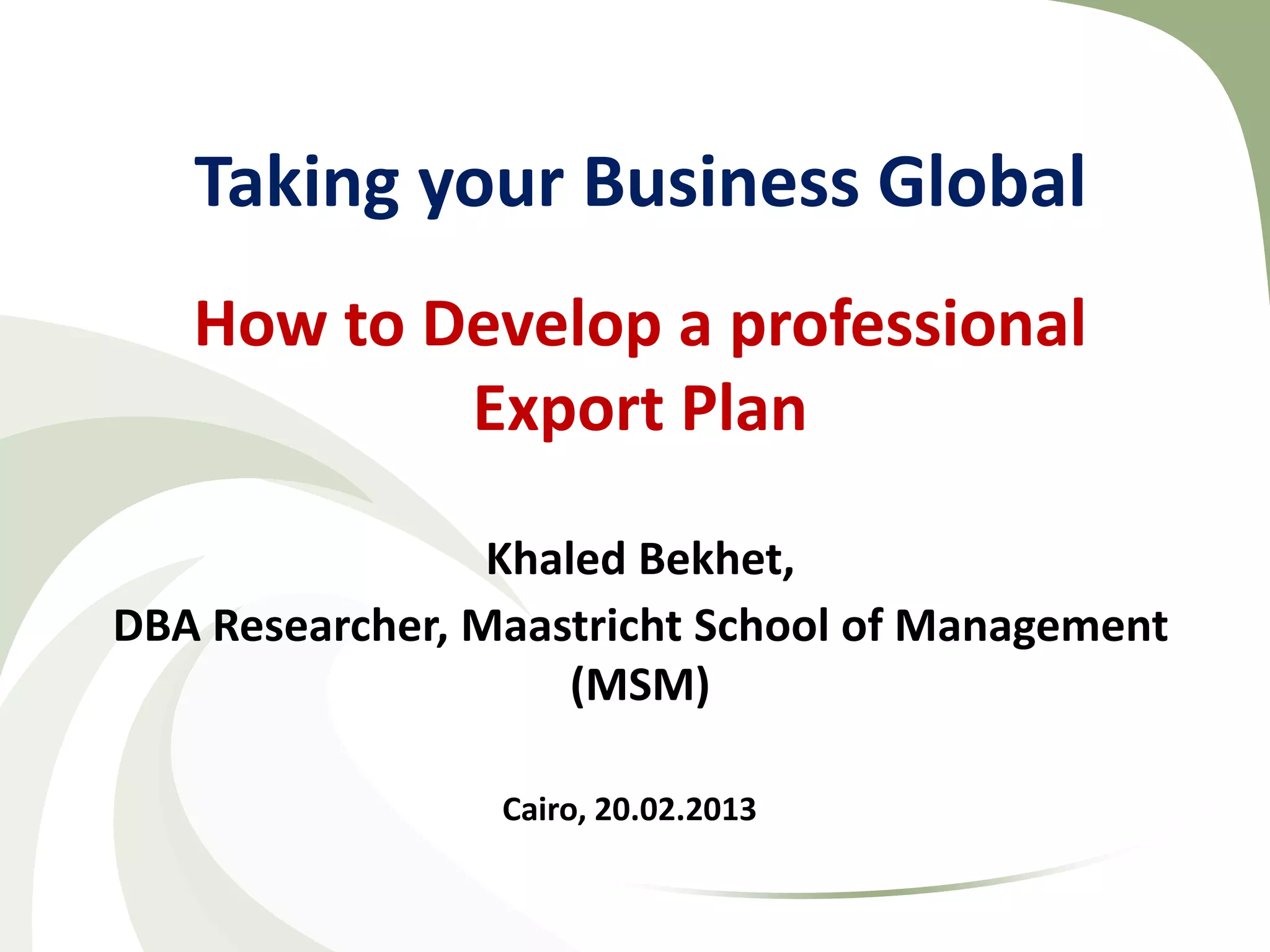 This document provides guidance on developing an export plan to take a business global. It outlines key components to include in an export plan such as goals, financial and resource budgets, production capacity, target markets, risk profile, credit and return policies, shipping and logistics, export licenses, and health and language requirements. The plan development process involves researching markets, regulations, and identifying strengths and weaknesses to maximize opportunities and minimize risks of expanding exports internationally.