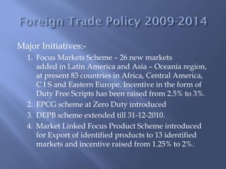 1. The document discusses various export initiatives and targets in India including adding new focus markets, duty incentives, and increasing annual export growth targets.