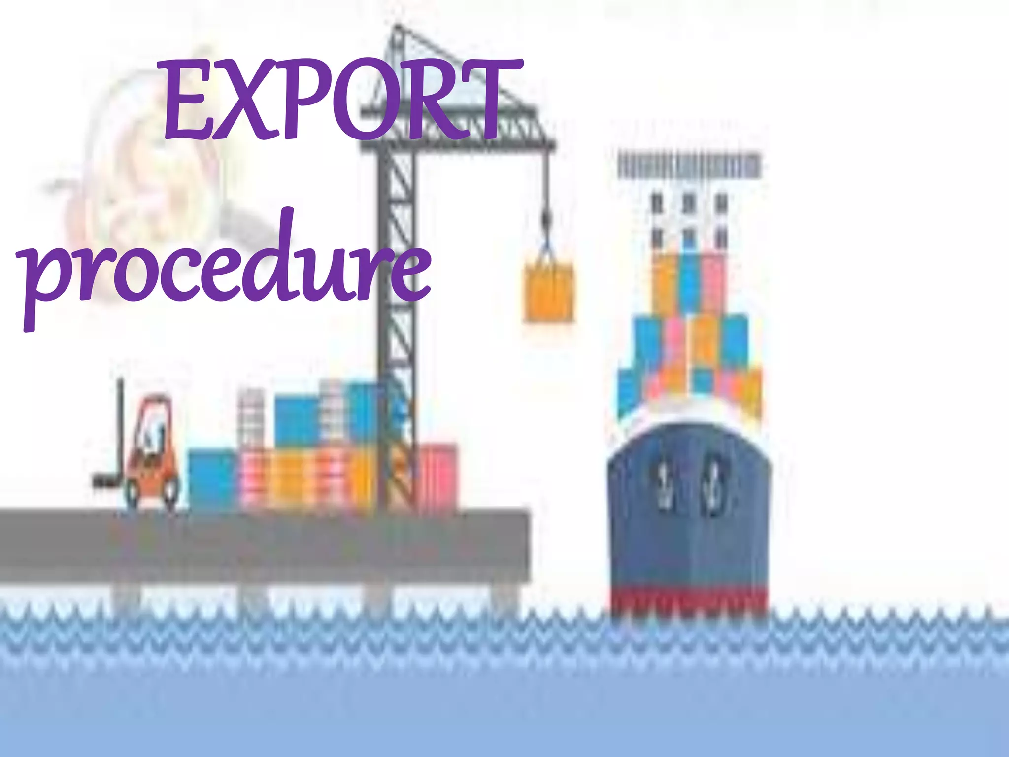 To export or import goods from India, a business or individual must obtain an Import Export Code (IE Code) from the Directorate General of Foreign Trade after obtaining a Permanent Account Number and opening a bank account. The export procedure involves registration of the organization, obtaining necessary codes and licenses, pre-shipment activities like order confirmation and goods production, shipment which covers shipping documentation and customs clearance, and post-shipment tasks like submitting documents and realizing payment.