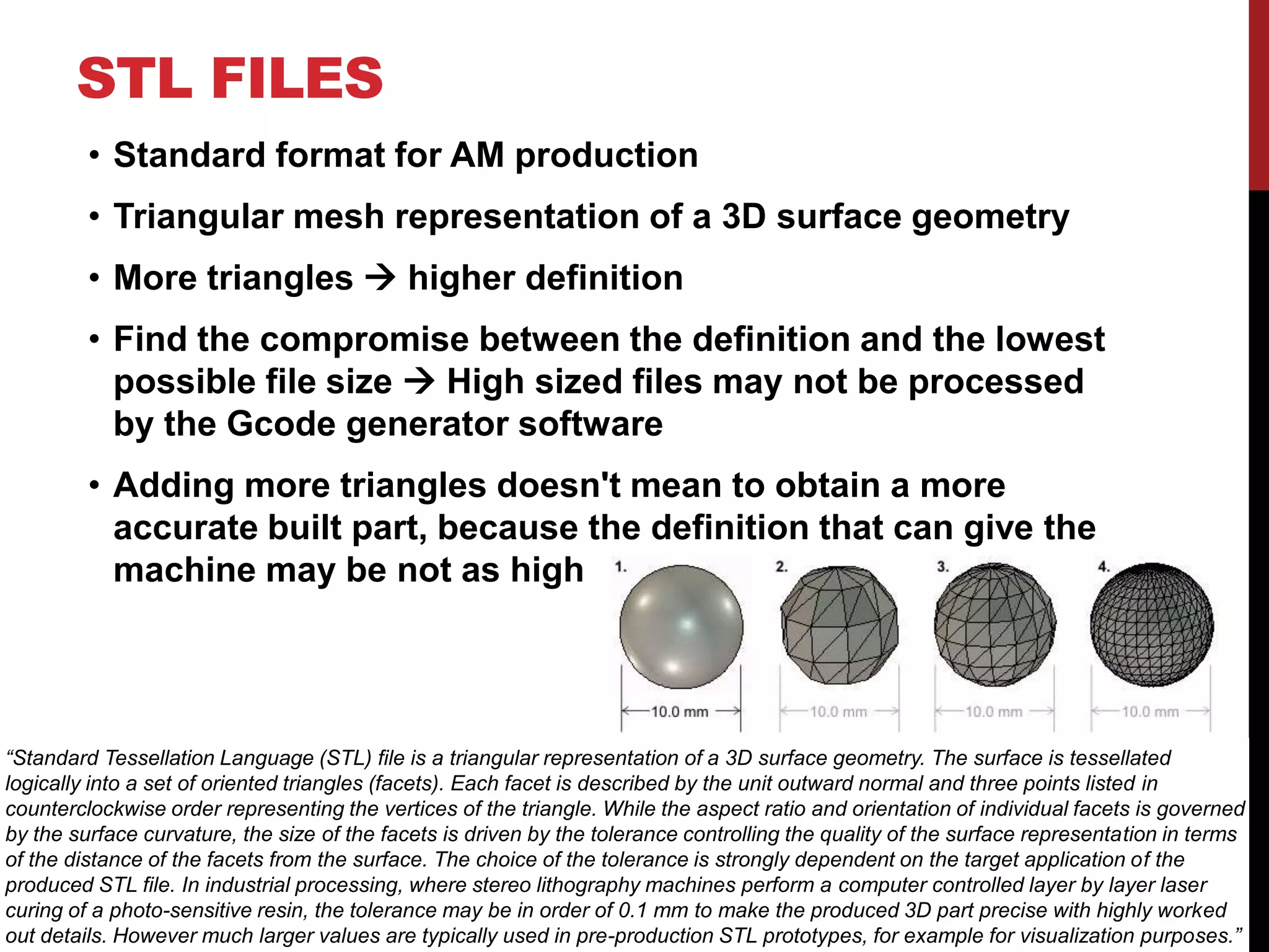 Standard Tessellation Language (STL) files represent a 3D surface as a set of triangular facets and are commonly used for 3D printing and additive manufacturing. When exporting a CAD model to an STL file, it is important to balance the triangle count and file size by adjusting the resolution settings. A higher resolution with more triangles provides more detail but a larger file, while too low a resolution risks losing important surface details in the 3D printed part. Proper STL export settings depend on the complexity of the model surfaces and size.