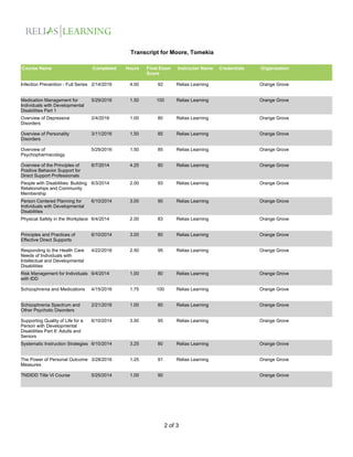 The document appears to be a training transcript that lists over 50 online courses completed by Tomekia Moore, including the course name, date completed, hours spent, and final exam score. Most courses were taken through Relias Learning and covered topics like abuse, autism, bipolar disorder, confidentiality, cultural competence, developmental disabilities, hazards, and substance abuse. The courses ranged from 0.25 to 4 hours and Moore scored 80-100% on final exams. The transcript certifies that Moore completed all listed trainings.