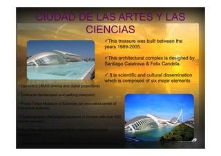 The document provides information about several landmarks in Valencia, Spain. It describes the City of Arts and Sciences complex, which was built between 1989-2005 and features six major elements including an IMAX cinema, aquarium, and performance halls. It also summarizes the Central Market, which originated in Muslim times and the current building was constructed in 1928. Additionally, it outlines the Quart Towers, which were built in the 15th century for military defense, and the Viveros park and Plaza de Toros bullring in Valencia.
