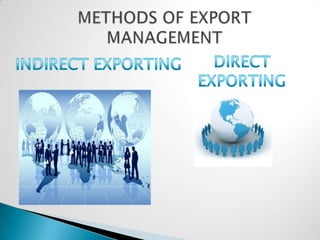 The document discusses various methods that companies can use to export their products internationally. It describes indirect exporting, where a company uses intermediaries to export without directly dealing with foreign customers, and direct exporting, where a company directly sells abroad through their own affiliates, branches, or export department. It also outlines challenges that small companies face with exporting and provides an example of Colombia's flower exports for Valentine's Day.
