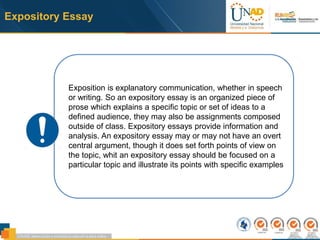 This document provides information about expository essays, including their purpose, components, and examples. An expository essay explains a topic without taking a position and uses specific examples to illustrate its points. It should have an introduction with a clear thesis, three body paragraphs with evidence connecting back to the thesis, and a conclusion that restates the thesis. The document also provides references on essay writing.