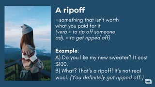1. The document provides instructions to listen, repeat, and practice conversational expressions. It encourages practicing the expressions in discussions and communities while reading them aloud with emotion. 2. The document then lists example conversational expressions to practice, such as "Here we go!", "Are you kidding me?", and "I can't wait to [verb]". 3. It emphasizes continuing to practice the expressions by engaging in the community and taking quizzes in the course.