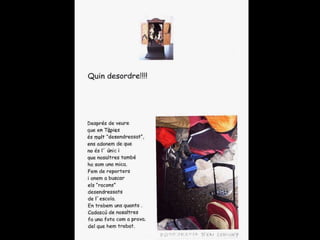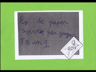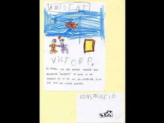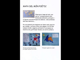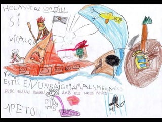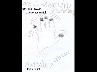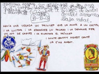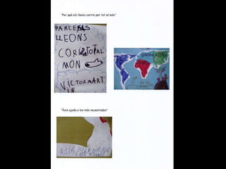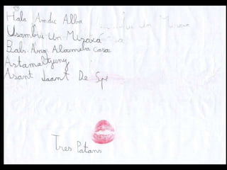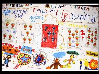 Missatge dins d´unaampolla Parlem sobre el que és un missatge i sobre per a què es podria fer servir. Acordem fer servir ampolles per escriure missatges a altres nens i nenes del món. Llavors el Marc intervé amb una pregunta: “ I què passa si els nostres missatges van a parar a un país on no entenen la nostra llengua?” Hi pensem. El Joan diu que com el seu pare viatja molt, pot anar a traduir els missatges. Al final decidim fer servir paraules i dibuixos per fer- nos entendre i pintar- nos els llavis per enviar petons estampats. També podem escriure el nostre missatge en idiomes diferents. L´activitat creix. Dins les ampolles ja no hi caben més missatges!.