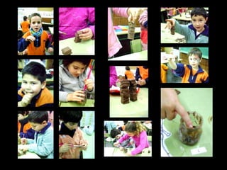 Tothom té elseu paquet de xocolata.Com que ens ve molt de gust de berenar- ne, per no fer salivera, en mengem una miqueta i després ja ens posem a treballar. La feina és fàcil, hem de tallar presses de xocolata per fer “torres”. Com que volem que se´ns aguantin, enganxem les peces entre sí amb xocolata desfeta. Escampem entre les peces aquesta “cola màgica” amb pinzells o amb els dits. No cal dir que la tarda es torna especial, l´ambient canvia, l´aire es fa dolç, llaminer,ple de perfum de xocolata… El Mario Pizarro diu:” aquest any m´ho estic passant molt bé” i jo penso : Fantàstic, genial! Feina aconseguida! Un dels objectius del curs s´ha complert. Gaudim amb la plàstica i ens endinsem en el seu llenguatge. No cal dir que hem acabat llepant dits, pots i pinzells… i a més treballant en grup sense barallar- nos !.