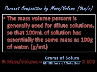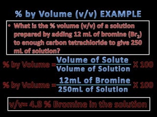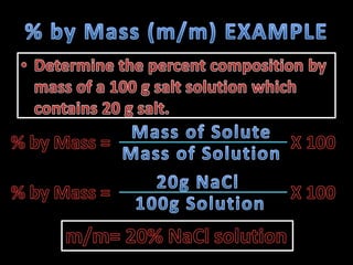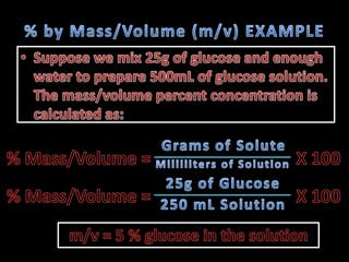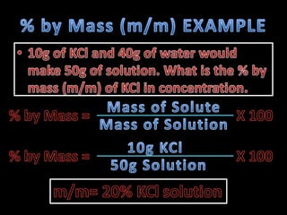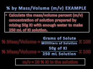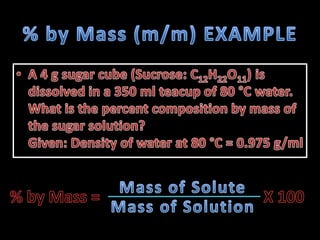 The document provides instructions for calculating concentrations in parts per million and parts per billion. It also gives an example of calculating the percentage composition by mass of a sugar solution containing 4g of solute and 341.25g of solvent. The total mass of the solution is 345.25g and the percentage composition of the sugar is 1.16%.