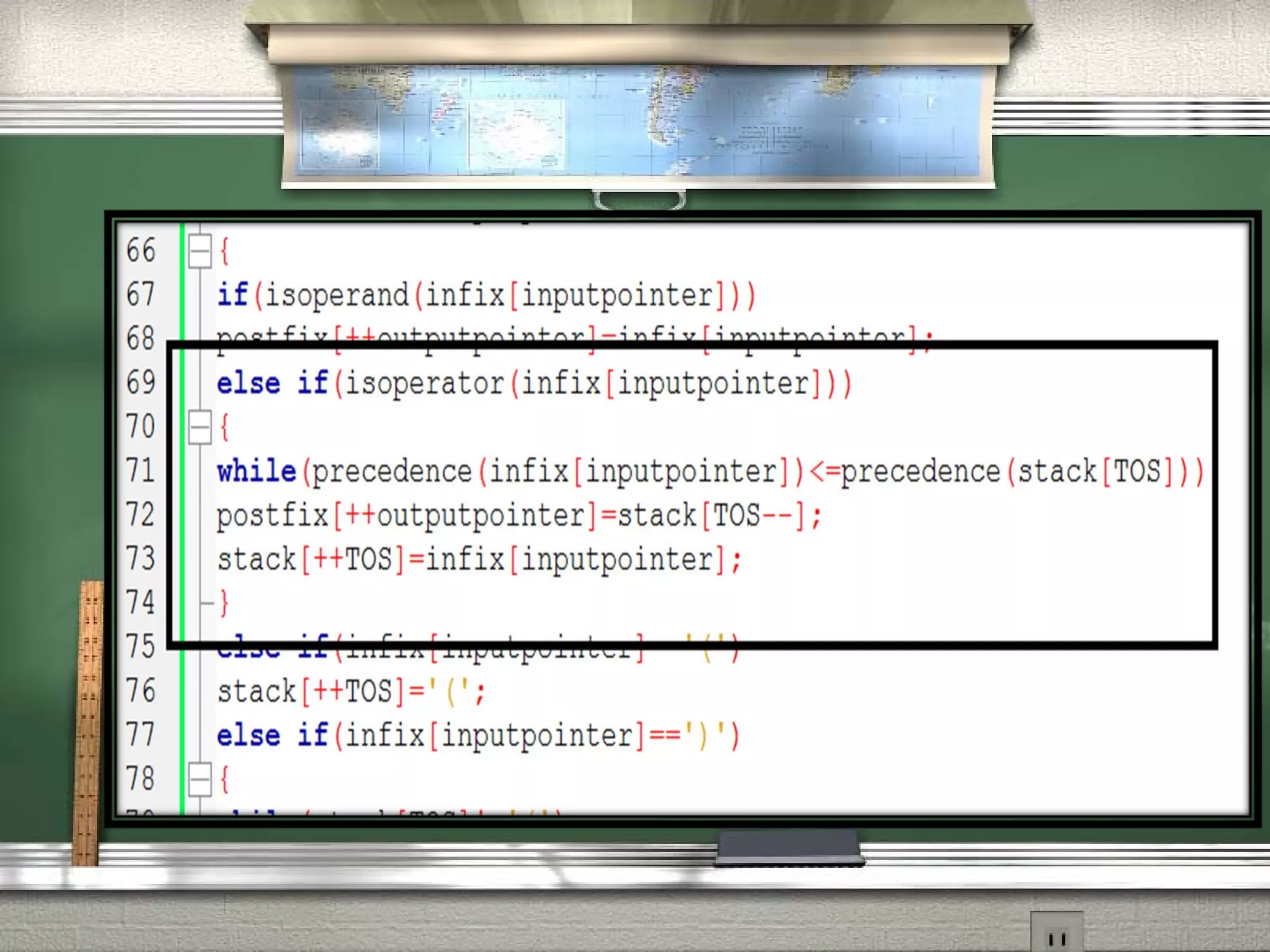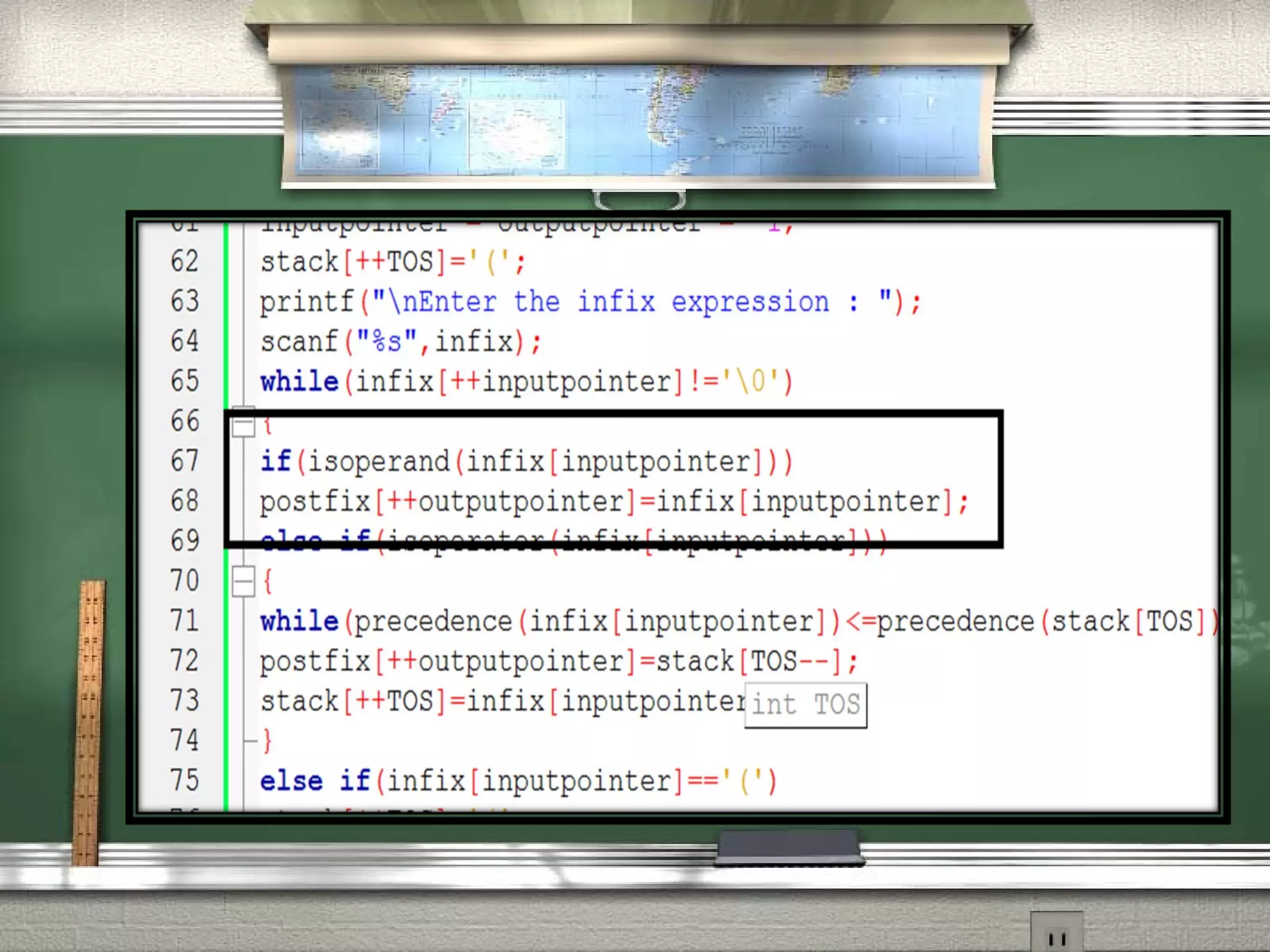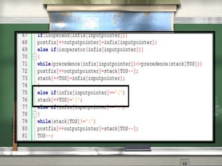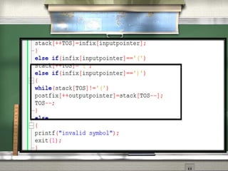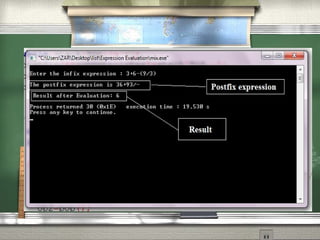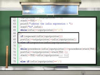 This document discusses different notations for representing mathematical expressions: infix, prefix, and postfix. In infix notation, operators are placed between operands (e.g. A + B). In prefix notation, operators come before operands (e.g. + A B). In postfix notation, operators follow operands (e.g. A B +). It notes that infix notation requires parentheses to determine the order of operations, while prefix and postfix notations do not. The document then provides a step-by-step example of converting an infix expression to postfix notation using a stack.