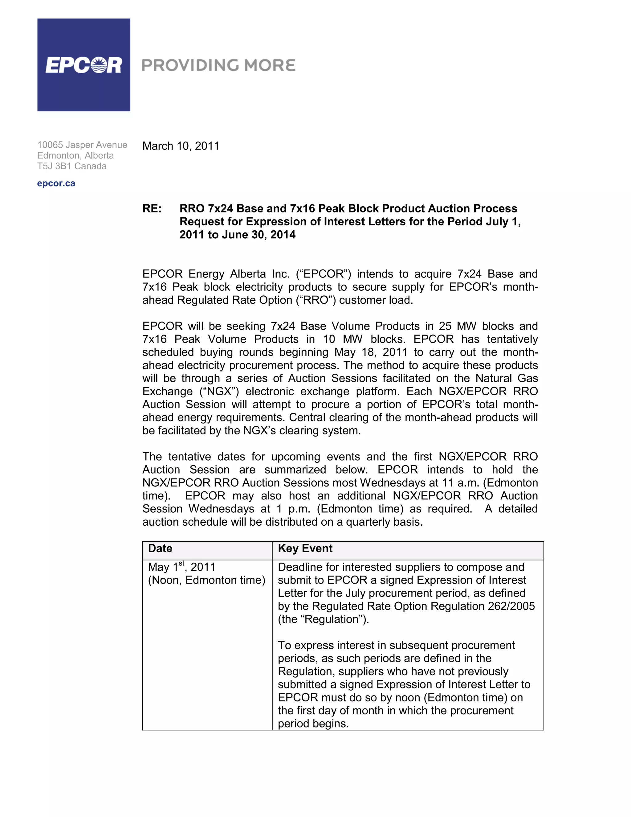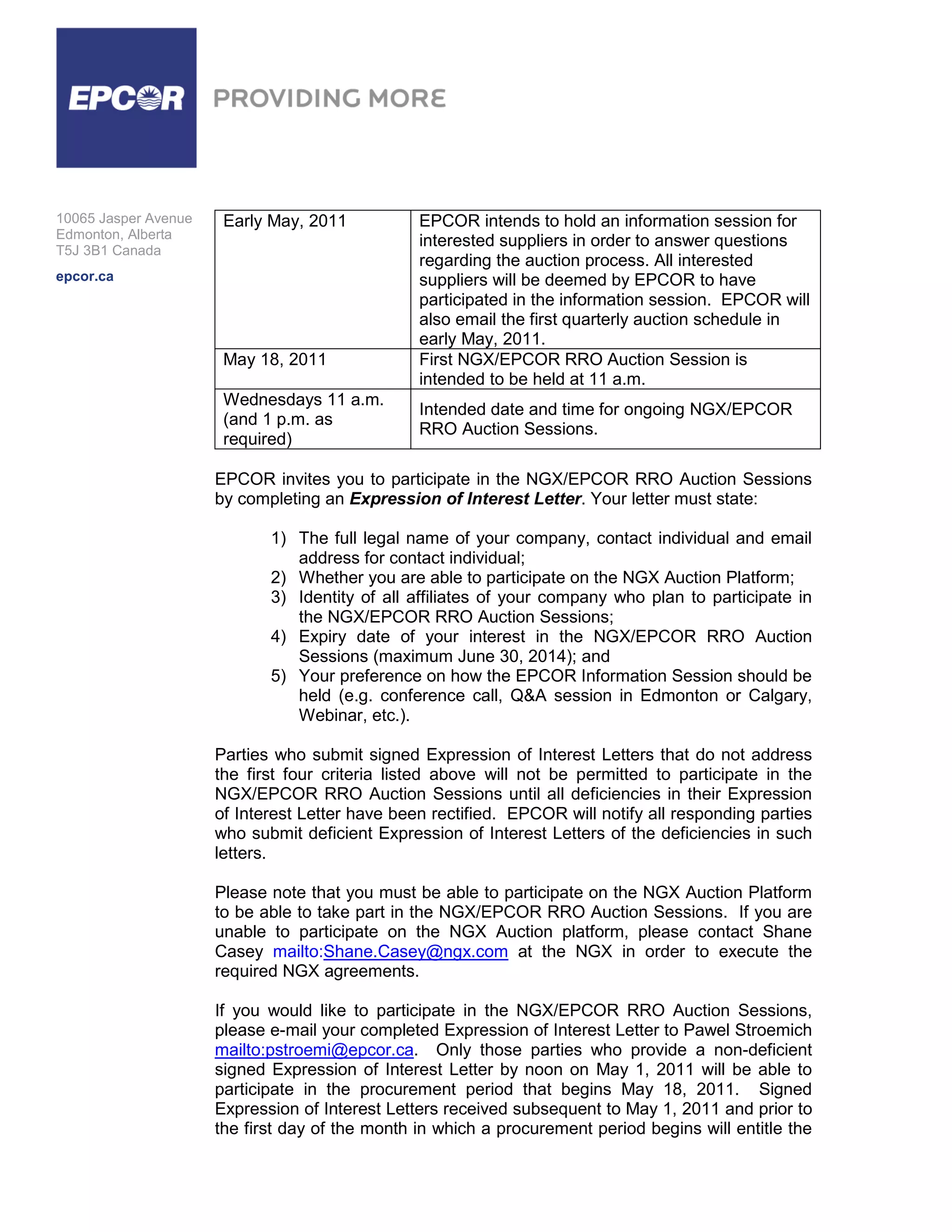 EPCOR intends to acquire electricity products through a series of auction sessions on the Natural Gas Exchange (NGX) electronic platform to supply their month-ahead regulated rate option customer load. Interested suppliers must submit an expression of interest letter by May 1st, 2011 to participate in the first auction on May 18th, 2011 or by the first of the month to participate in future auctions. The letter must include company information, ability to participate on NGX, affiliates, interest expiration of June 30th, 2014, and preferred format for an information session. EPCOR will notify suppliers of any deficiencies in their letter.