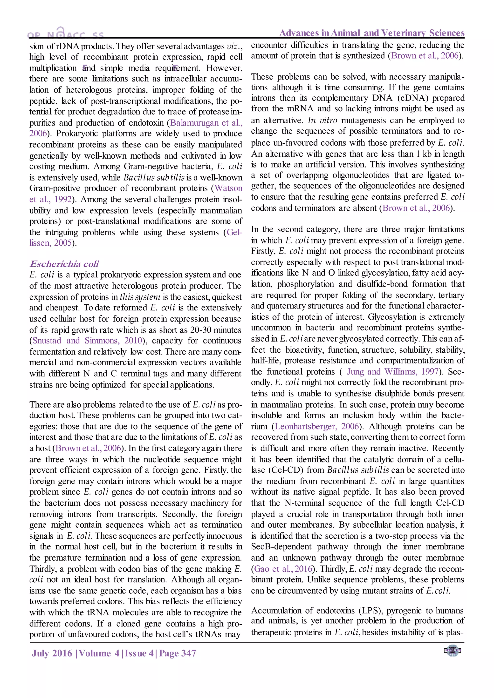 The document discusses different host systems for producing recombinant proteins, including prokaryotic and eukaryotic systems. It focuses on the bacterial expression system Escherichia coli (E. coli) as a widely used prokaryotic host. While E. coli allows high levels of recombinant protein expression at low cost, it has limitations such as a lack of post-translational modifications and improper protein folding. Recent research has shown some success in secreting recombinant proteins from E. coli to circumvent some of these limitations. The document examines advantages and challenges of various host systems for recombinant protein production.