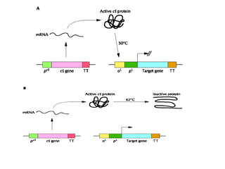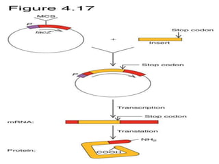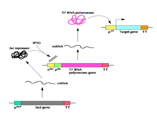 The document discusses different expression vectors and systems used for recombinant protein expression. It describes key elements required for an expression vector including an origin of replication, selective marker, promoter, multiple cloning site, and terminator. It provides details on commonly used expression systems in E. coli such as the lac, tac, lambda PL, and T7 promoters. It also summarizes protein expression in yeast using the galactose-inducible GAL promoter system.