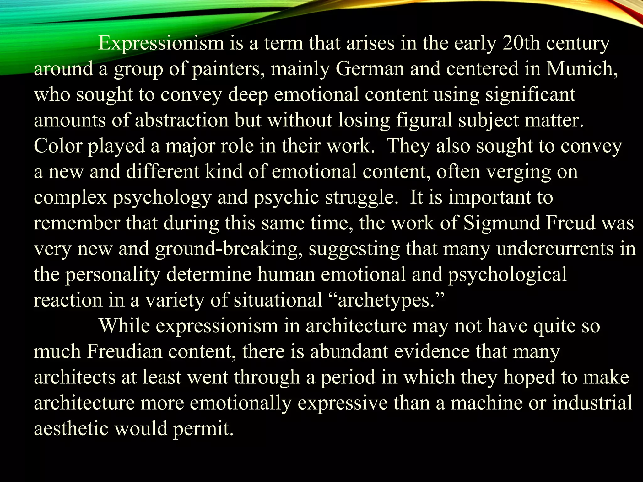 This document discusses expressionism in modern and contemporary architecture. It begins by defining expressionism in painting in the early 20th century, noting the emphasis on conveying emotion through abstraction. In architecture, expressionism sought to make buildings more emotionally expressive through sculptural, sometimes irrational forms reflecting the architect's personality. Several key expressionist architects are discussed, including Bruno Taut, Erich Mendelsohn, and Rudolf Steiner, along with some of their most celebrated works employing expressionist styles like the Glass Pavilion, Einstein Tower, and Goetheanum buildings. The document explores how expressionism is not always clearly defined and can overlap with other styles, but generally features distorted, sculptural forms conveying emotion, spirit
