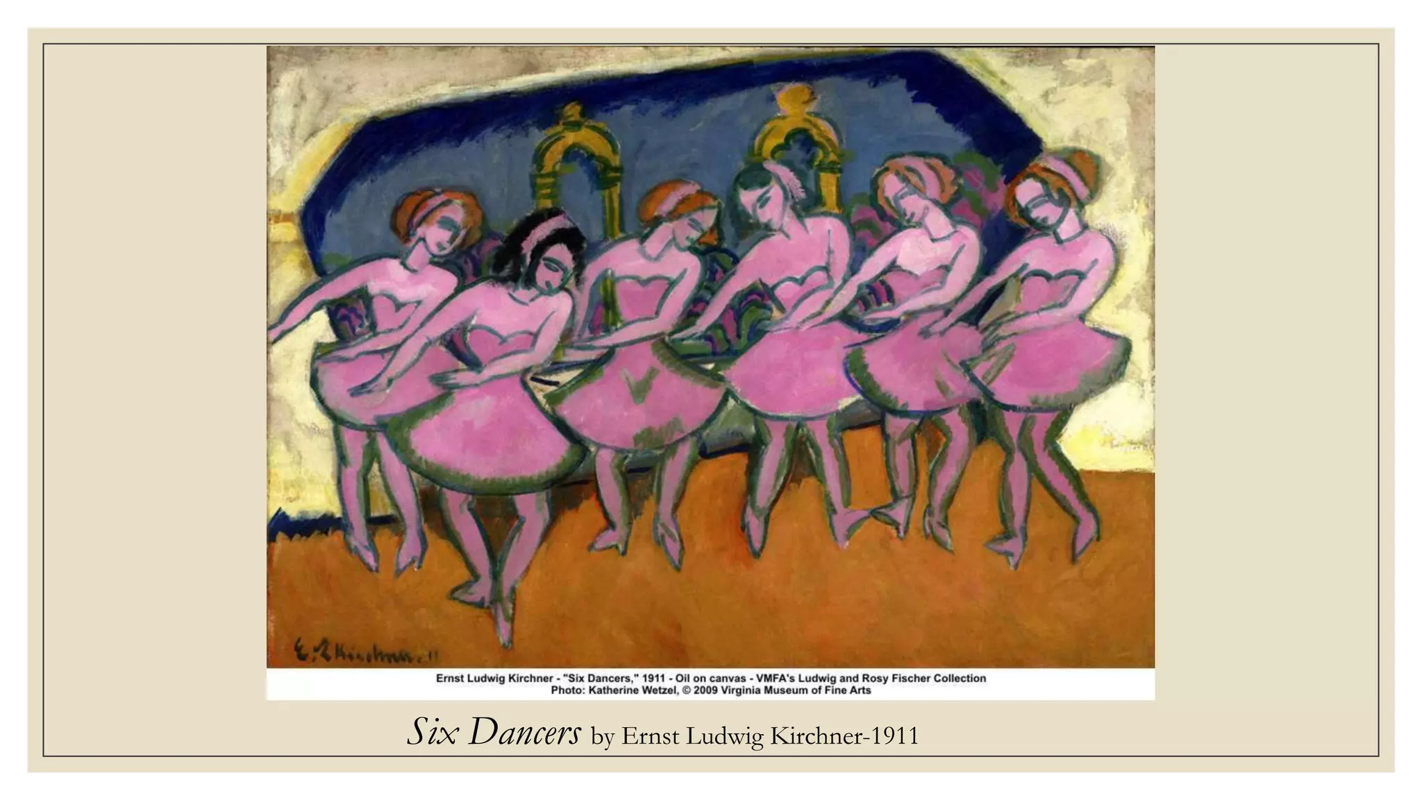 This document provides an overview of Expressionism in art. It describes two key Expressionist groups that formed in Germany in the early 20th century: Die Brucke and Der Blaue Reiter. Expressionist art was a revolt against Impressionism, featuring distorted subjects, bold colors, and emotional content intended to connect with viewers. Key artists discussed include Kirchner, Kandinsky, Marc, Munch, and Van Gogh, whose work influenced Expressionism through use of color, brushstrokes, and subject matter to express inner feelings and dreams. Expressionism also impacted literature, drama, film, and music through experimental approaches.