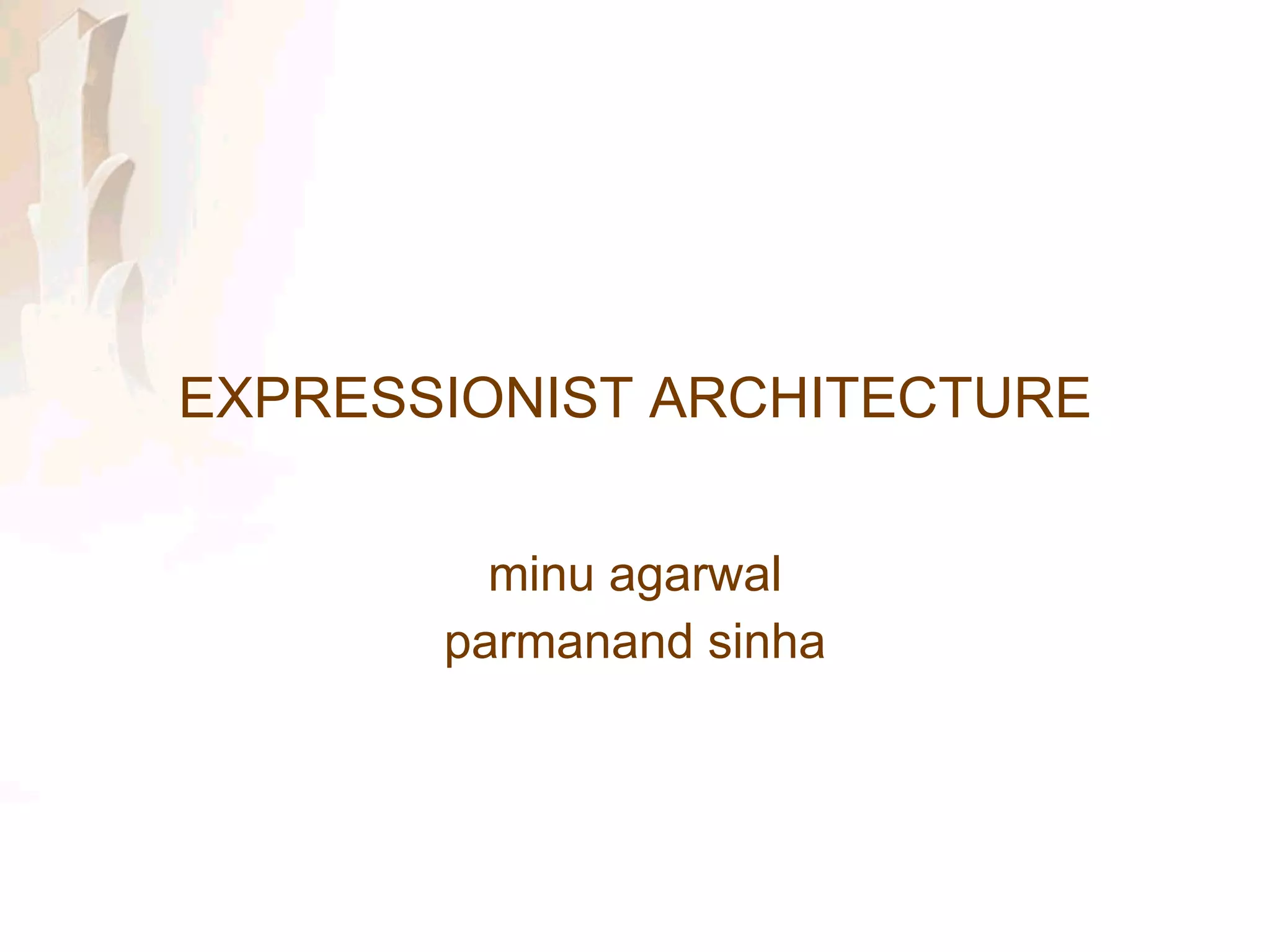 The document discusses Expressionist architecture, an avant-garde movement that sought to transform reality rather than imitate it. Expressionism emerged from Art Nouveau in the early 20th century and was influenced by the trauma of World War I, during which architects were freed from practical constraints. Notable Expressionist architects included Erich Mendelsohn, Joseph Maria Olbrich, Rudolph Steiner, Eero Saarinen, and Frank Gehry. Their works featured organic, non-rectilinear forms meant to express deeper meanings rather than mimic surface appearances.