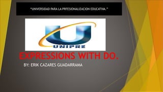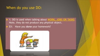 The document discusses the use of the verb "do" in different expressions and contexts. It explains that do is used to talk about work, jobs, or tasks that do not produce a physical object. Do is also used when referring to activities in general using non-specific words like thing, something, nothing. Do can replace other verbs when the meaning is clear, such as "do the kitchen" meaning clean the kitchen. Examples of expressions using do include "do a good job", "to do exercise", "to do the laundry", and "to do your duty." An exercise follows asking the reader to match expressions with do to corresponding pictures.
