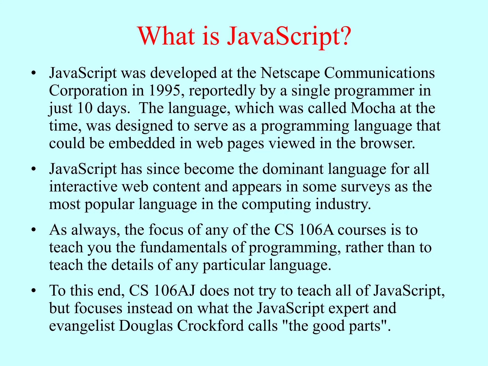The document provides an overview of JavaScript, including its history, fundamental programming concepts, and key features such as expressions, variables, functions, and data types. It emphasizes learning the 'good parts' of JavaScript while also discussing arithmetic expressions and the use of libraries, particularly the math library. Additionally, it covers important topics like variable declarations, naming conventions, and string operations such as concatenation.