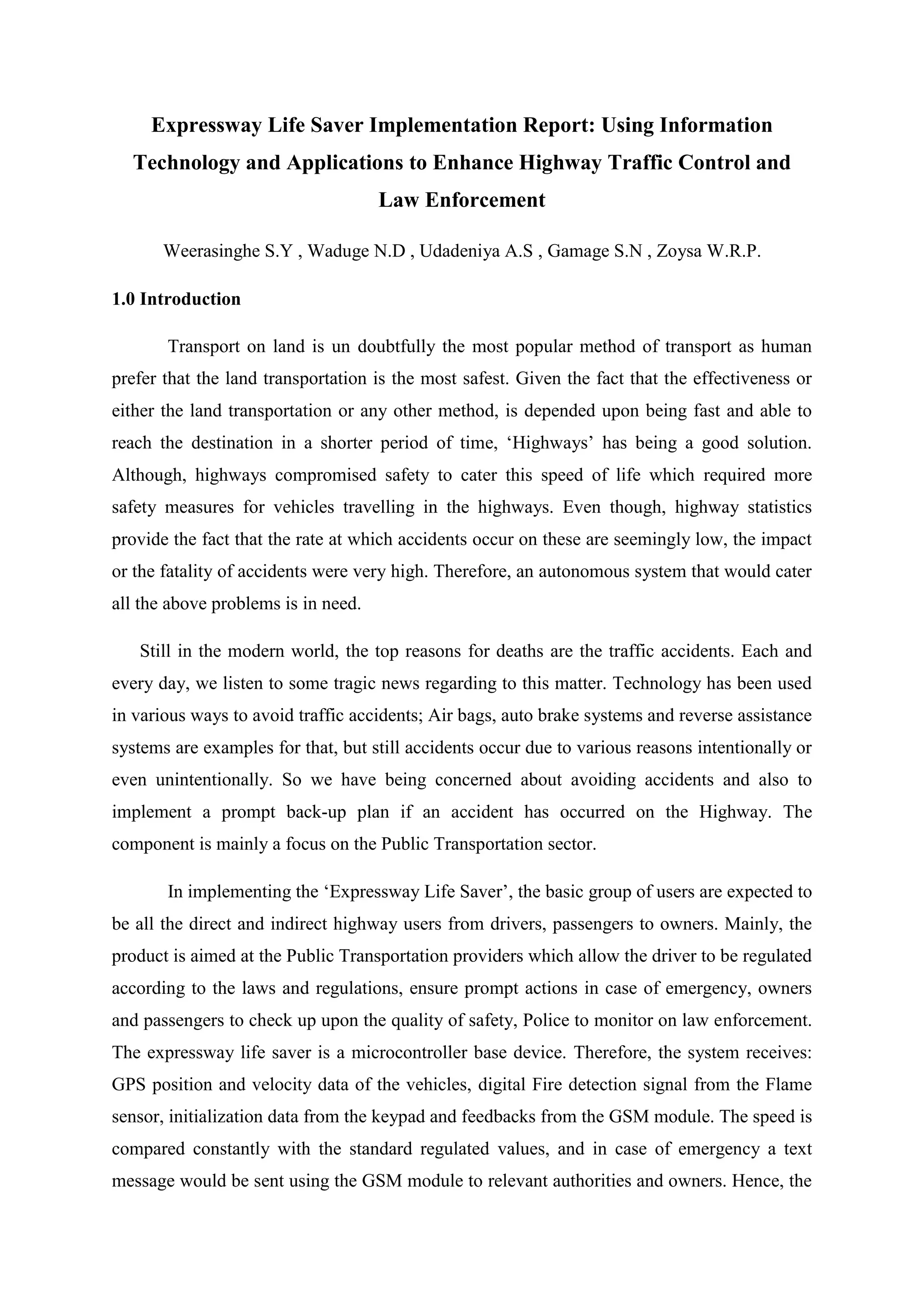 The 'Expressway Life Saver' implementation report details a microcontroller-based system designed to enhance highway safety by monitoring vehicle speed, detecting emergencies, and reporting incidents to authorities via GPS and GSM technology. This system aims to mitigate traffic accidents and improve law enforcement by maintaining a database of driver profiles and vehicle conditions accessible to the public. By streamlining communication during emergencies and encouraging compliance with traffic laws, the project seeks to create safer highways for all users.